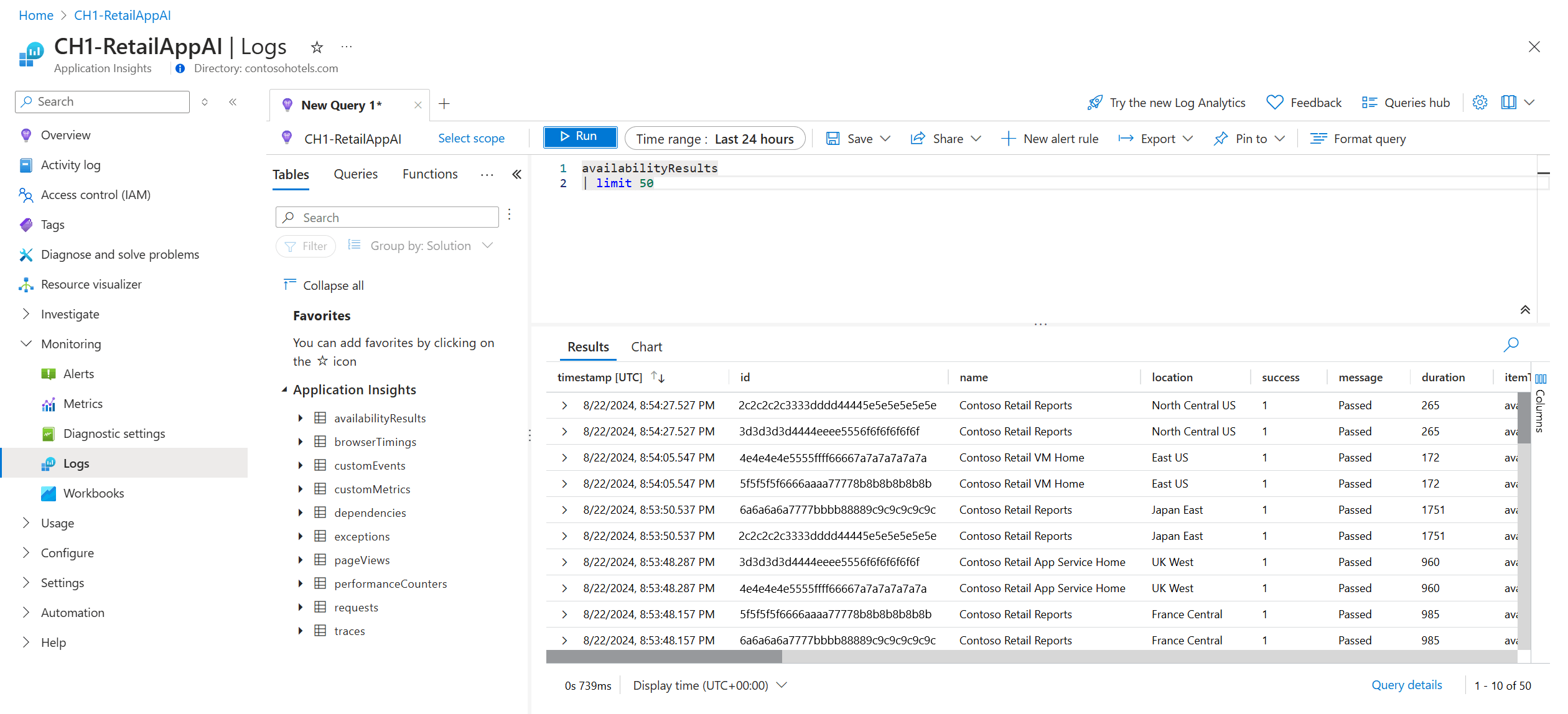 You can use Log Analytics to view your availability results (availabilityResults), dependencies (dependencies), and more. To learn more about Log Analytics, see Log query overview.