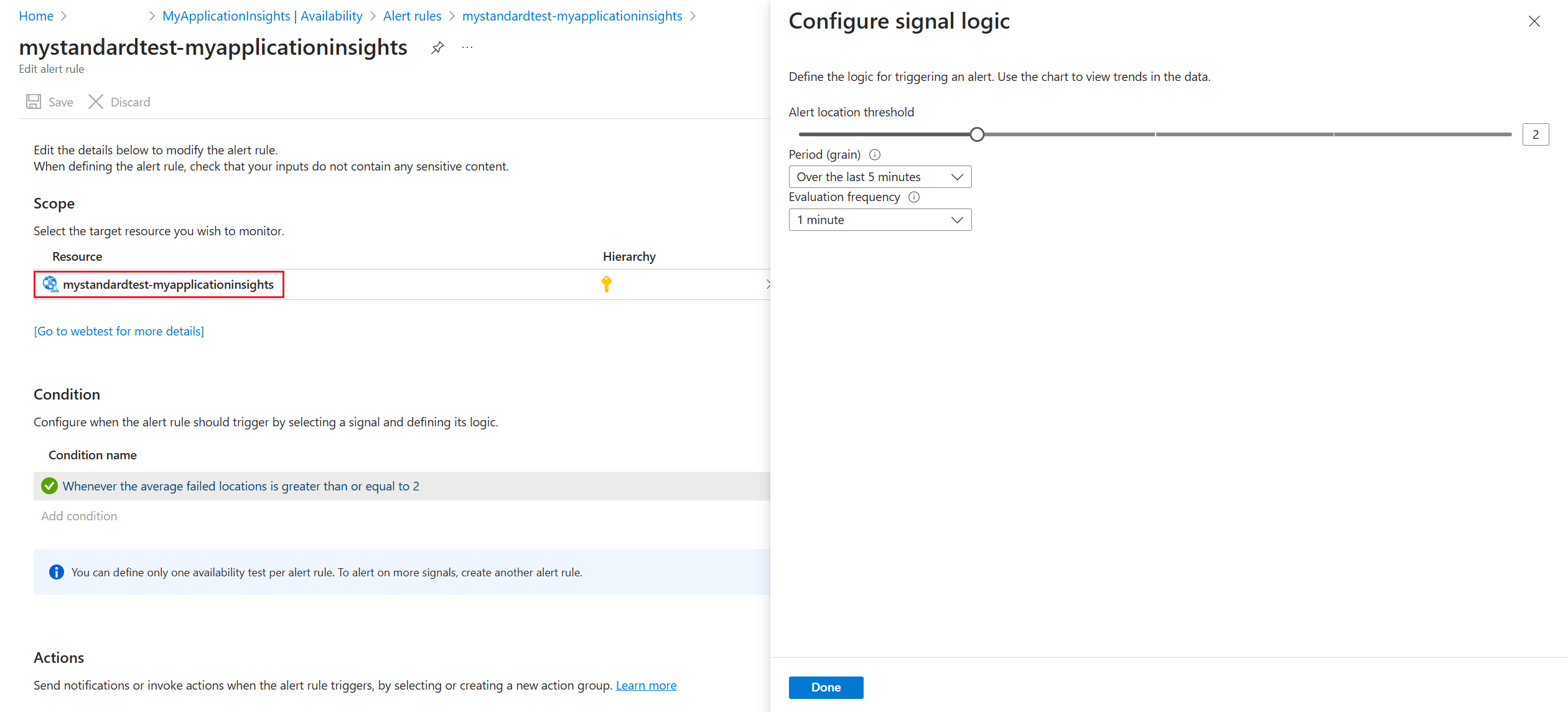 To make changes to the location threshold, aggregation period, and test frequency, go to the Edit alert rule page (see step 2 under Enable alerts), then select the condition to open the Configure signal logic window.