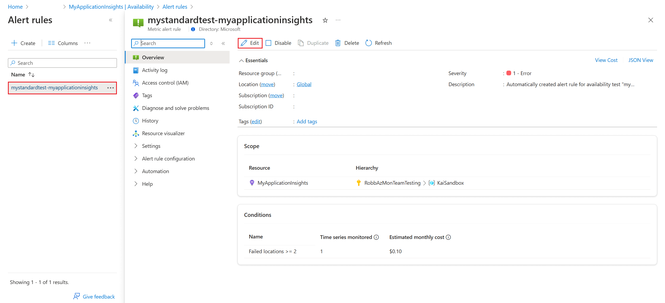 To edit, temporarily disable, or delete a test, open the context menu (ellipsis) by the test, then select Edit. It might take up to 20 minutes for configuration changes to propagate to all test agents after a change is made.