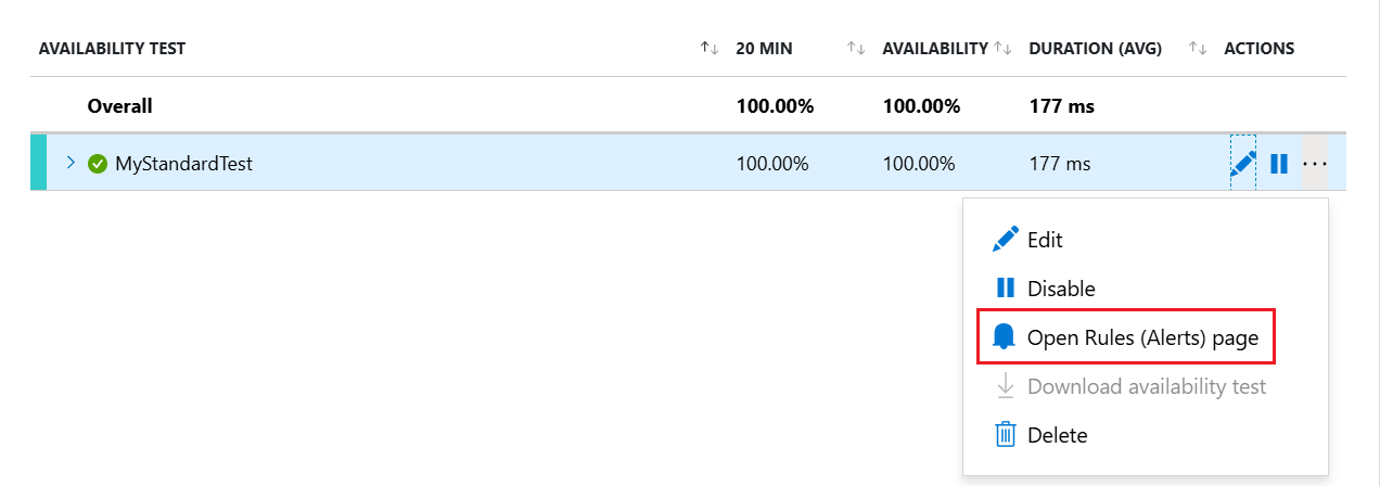 After you save the availability test, open the context menu by the test you made, then select Open Rules (Alerts) page.