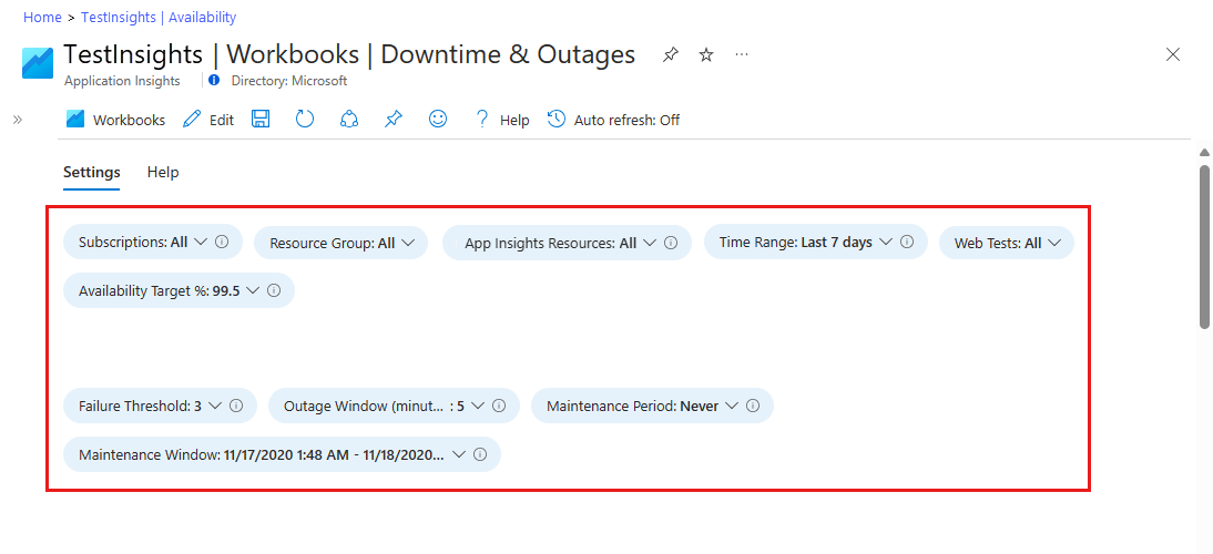 Subscriptions,App Insights Resources, andWeb Test: These parameters determine your high-level resource options. They're based on Log Analytics queries and are used in every report query.Failure ThresholdandOutage Window: You can use these parameters to determine your own criteria for a service outage. An example is the criteria for an Application Insights availability alert based on a failed location counter over a chosen period. The typical threshold is three locations over a five-minute window.Maintenance Period: You can use this parameter to select your typical maintenance frequency.Maintenance Windowis a datetime selector for an example maintenance period. All data that occurs during the identified period is ignored in your results.Availability Target %: This parameter specifies your target objective and takes custom values.