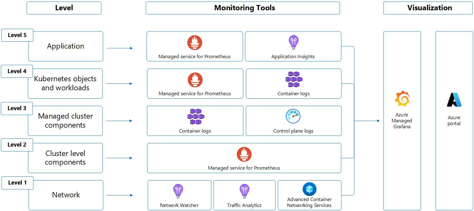 The Container levels include Kubernetes objects such as deployments, containers, and replicasets, cluster control plane components including API servers, cloud controller, and kubelet, and virtual machine scale sets abstracted as nodes and node pools. These layers are monitored with the following services.