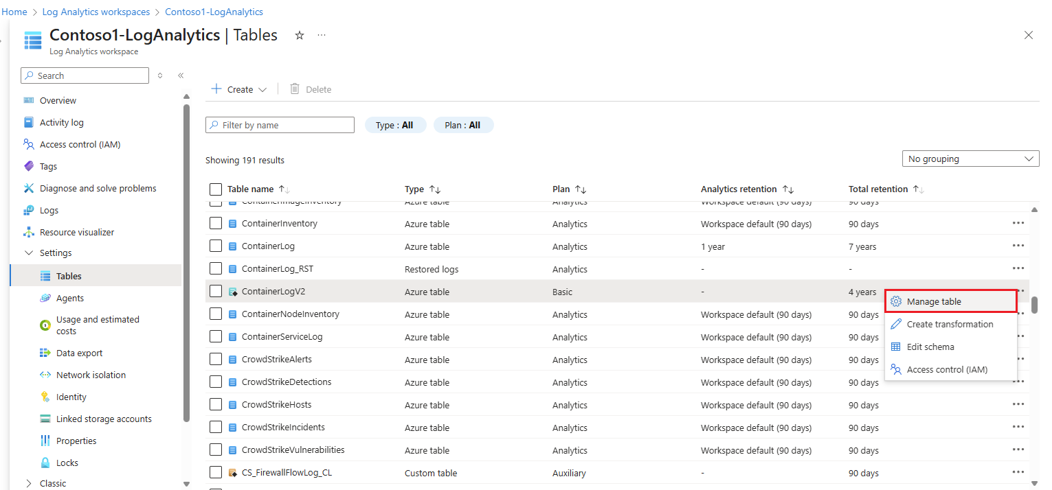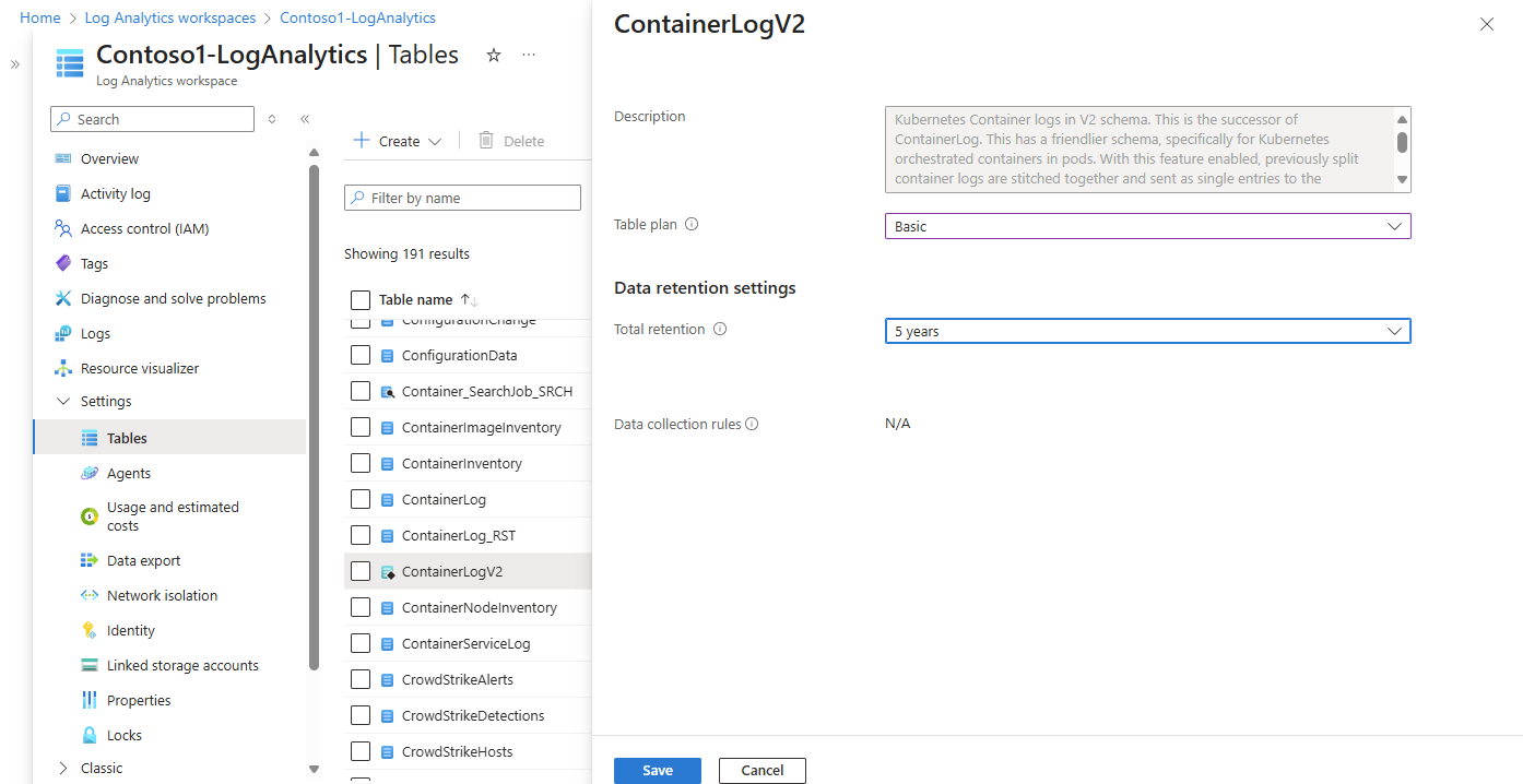 To view a table's retention settings in the Azure portal, from the Log Analytics workspaces menu, select Tables.