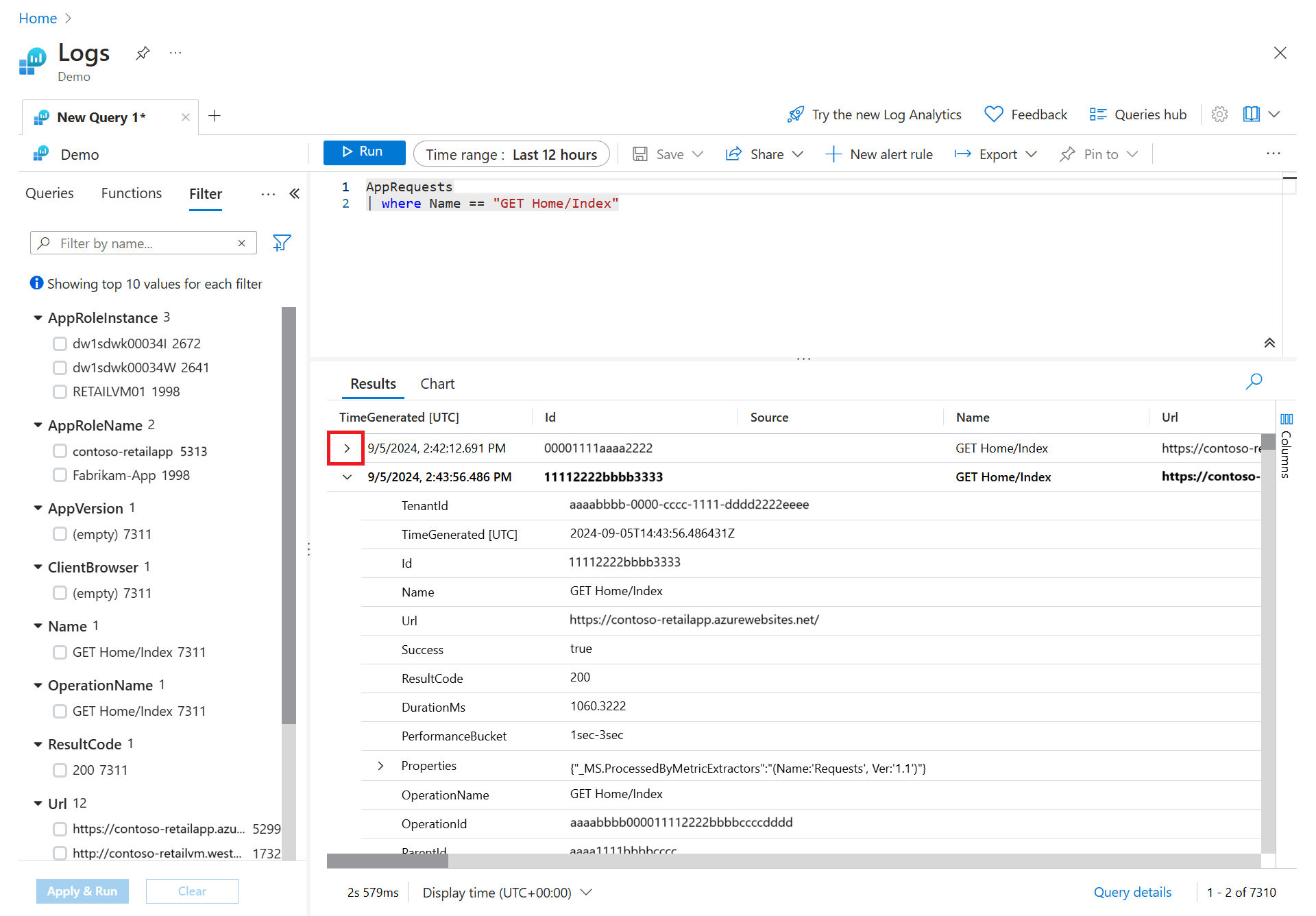 In addition to helping you write and run queries, Log Analytics provides features for working with the results. Start by expanding a record to view the values for all of its columns by clicking the chevron on the left side of the row.