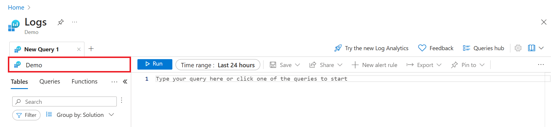 You can view the scope in the upper-left corner of the Logs experience, below the name of your active query tab. If you're using your own environment, you see an option to select a different scope. This option isn't available in the demo environment.