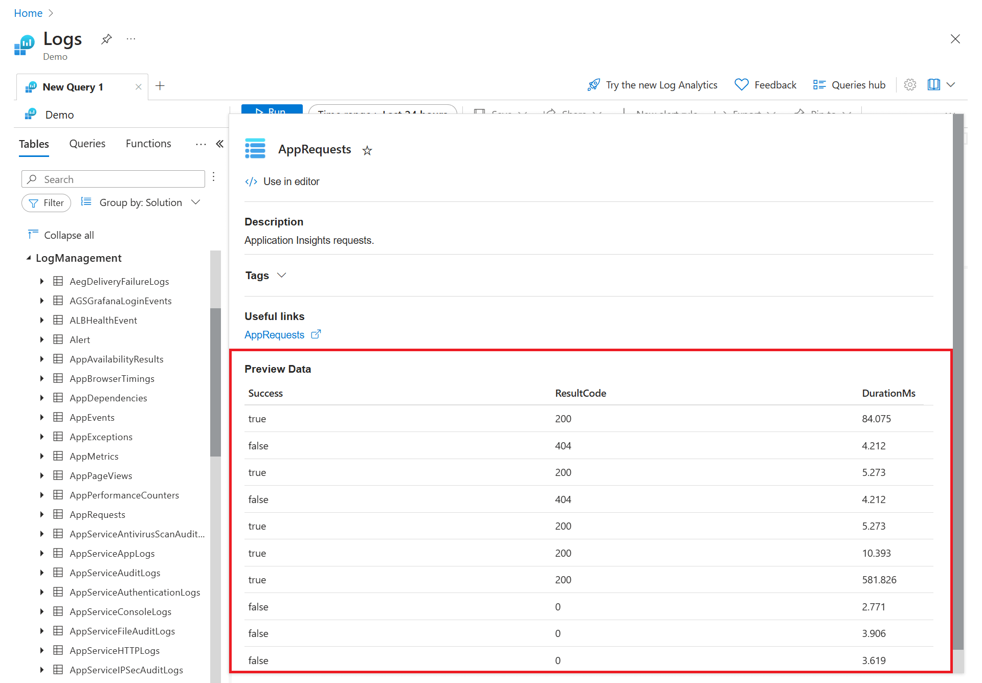 Expand the Log Management solution and locate the AppRequests table. You can expand the table to view its schema, or hover over its name to show more information about it.