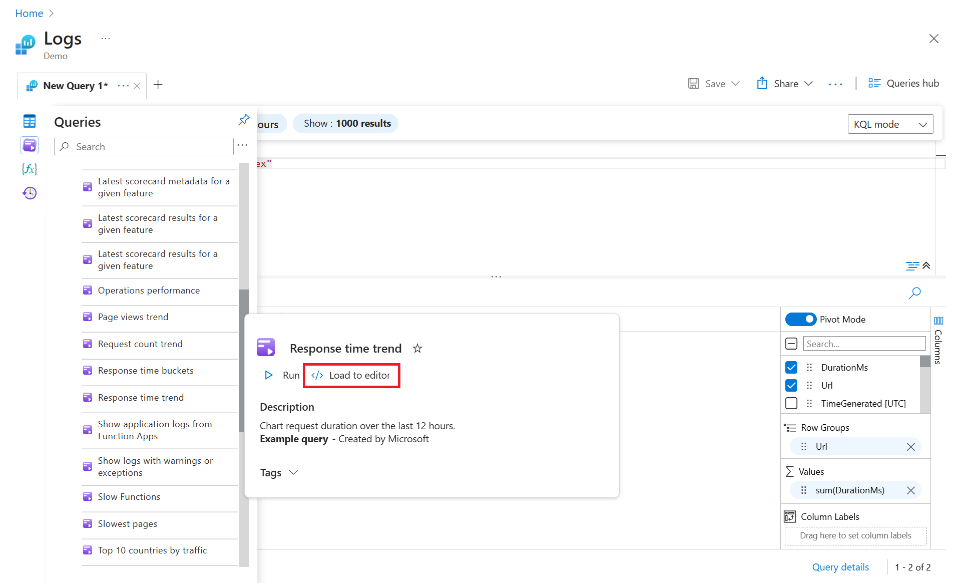 Load the Response time trend query in the Applications category to the editor. To do so, double-click the query or hover over the query name to show more information, then select Load to editor.