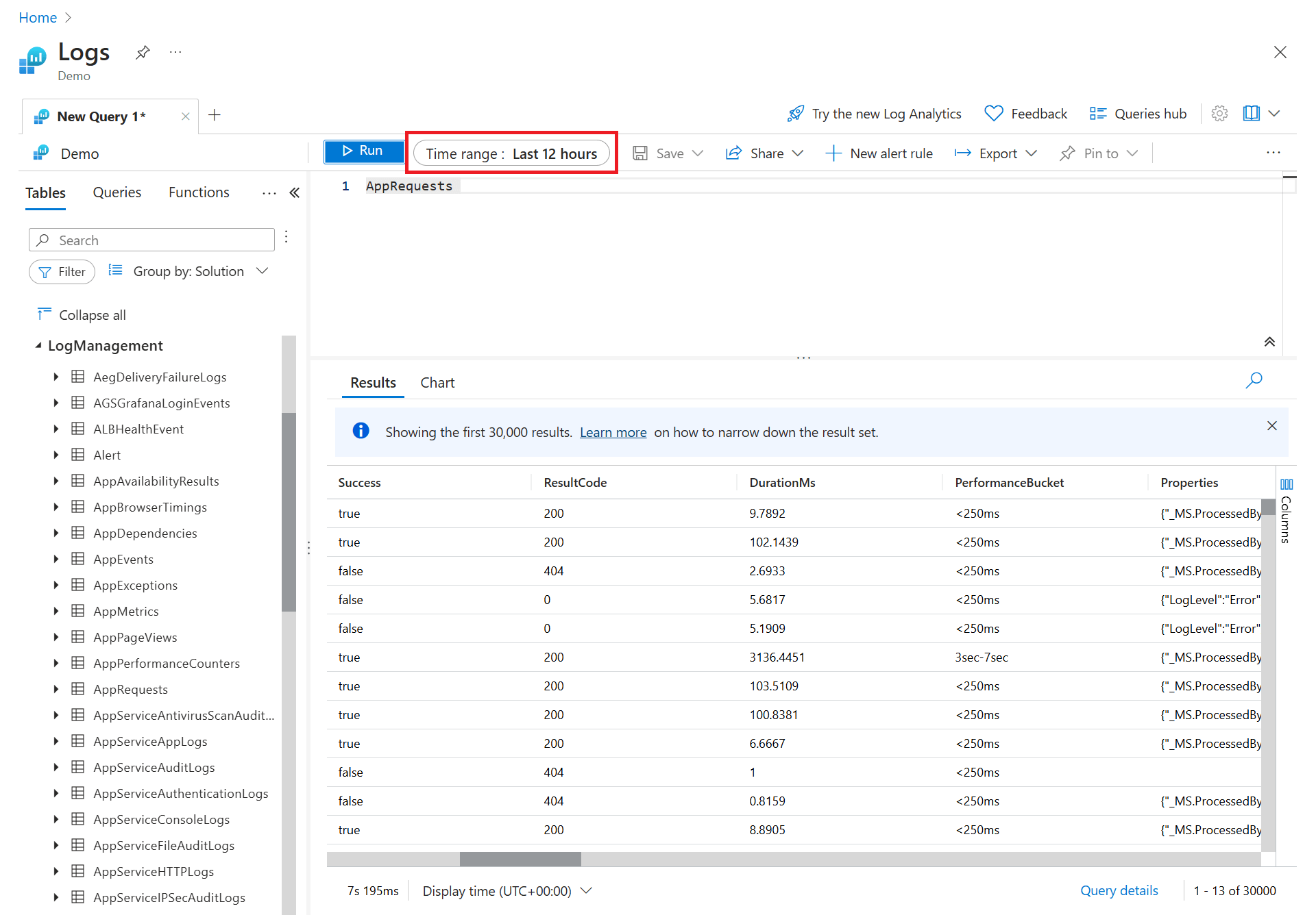 This tutorial uses the Log Analytics demo environment, which includes plenty of sample data that supports the sample queries. You can also use your own Azure subscription, but you might not have data in the same tables.