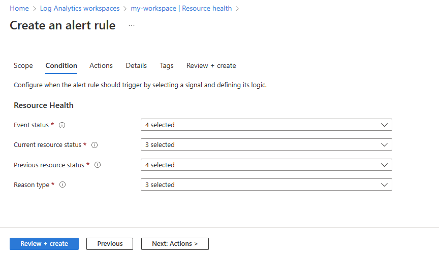 The Create alert rule wizard opens, with the Scope and Condition panes prepopulated. By default, the rule triggers alerts all status changes in all Log Analytics workspaces in the subscription. If necessary, you can edit and modify the scope and condition at this stage.