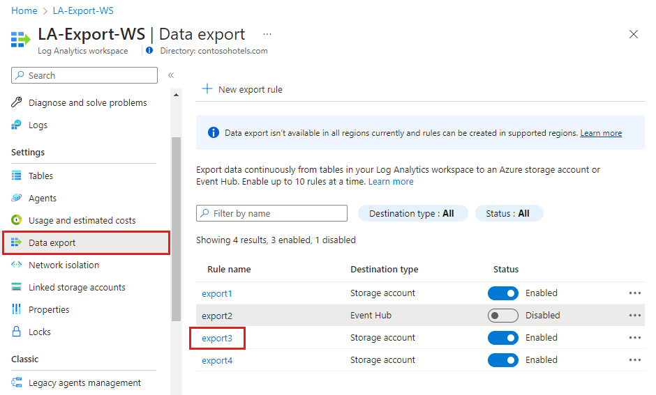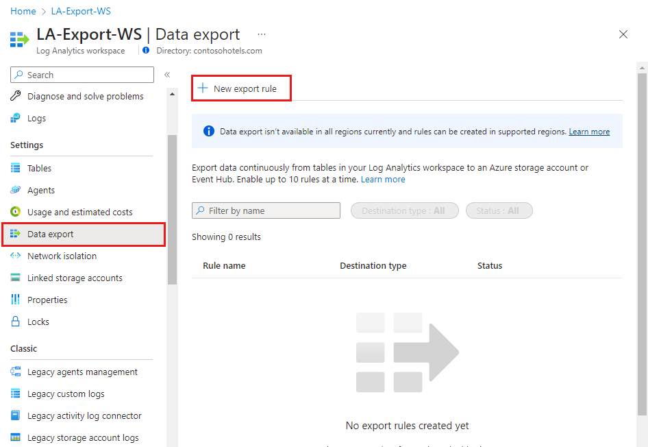On the Log Analytics workspace menu in the Azure portal, select Data Export under the Settings section to view all export rules in the workspace.