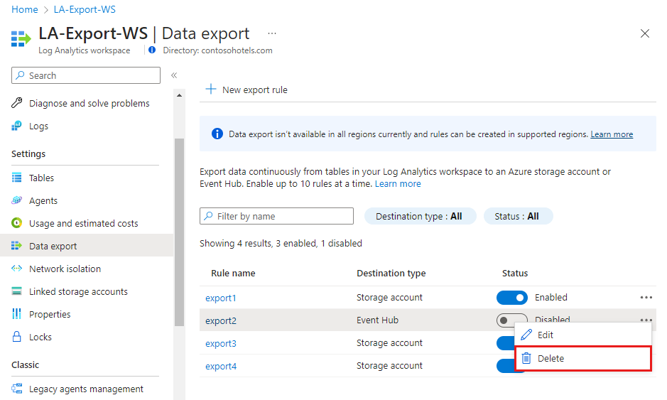 On the Log Analytics workspace menu in the Azure portal, select Data Export under the Settings section. Select the ellipsis to the right of the rule and select Delete.