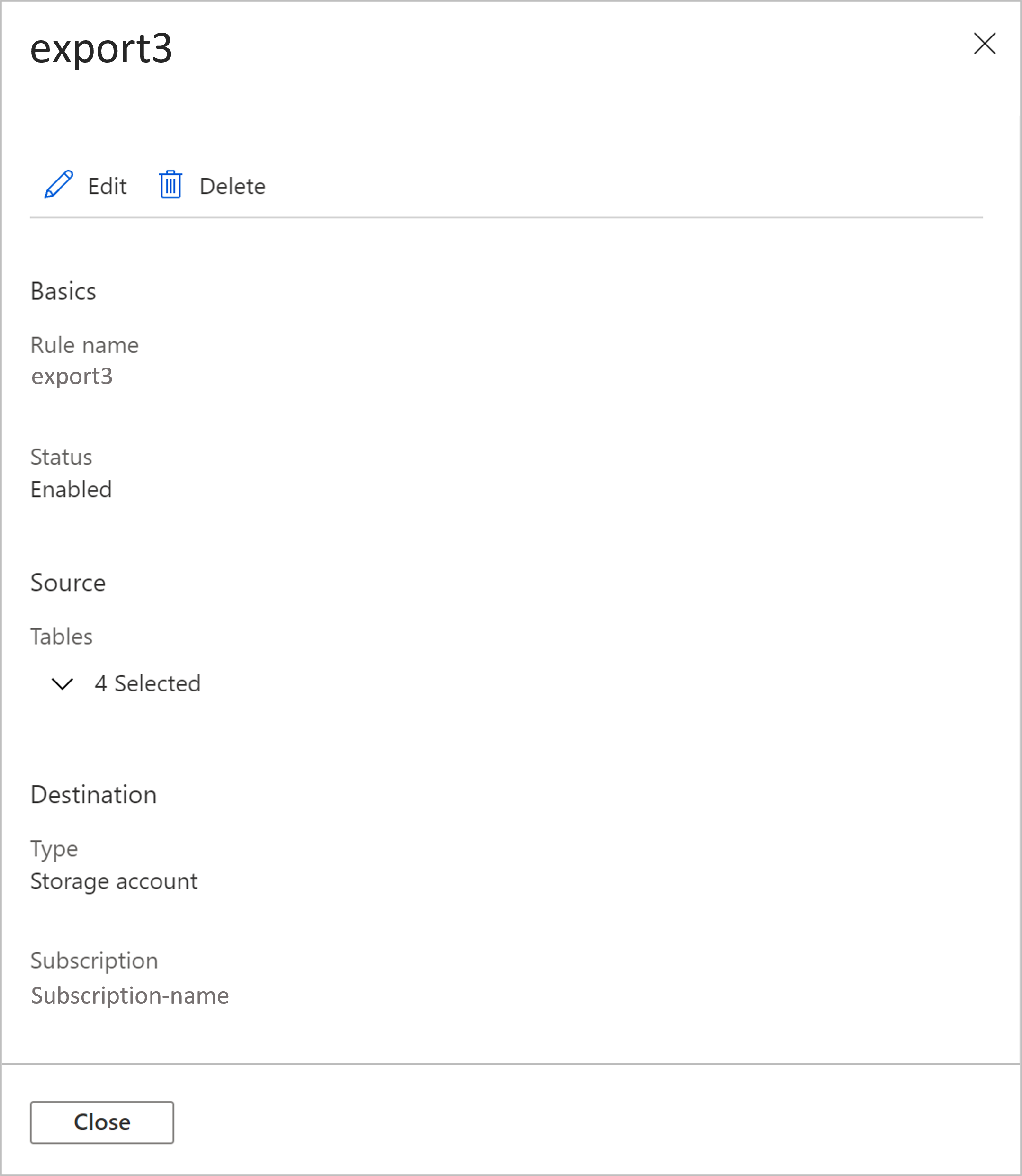 A data export rule defines the destination and tables for which data is exported. The rule provisioning takes about 30 minutes before the export operation initiated. Data export rules considerations: