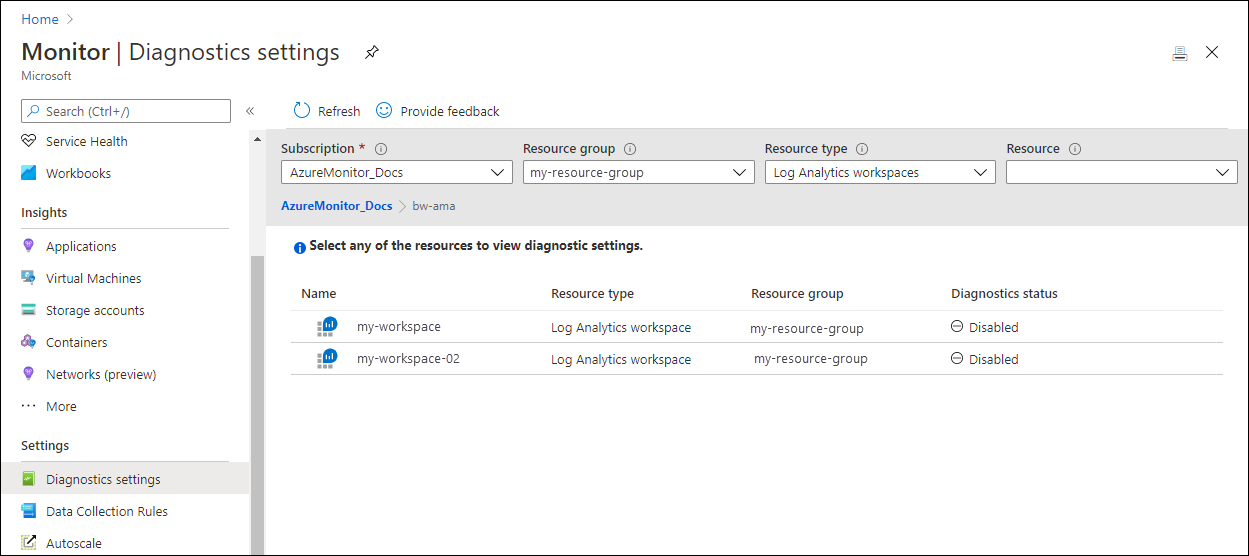 • From the Log Analytics workspaces menu, select the workspace, and then select Diagnostic settings.