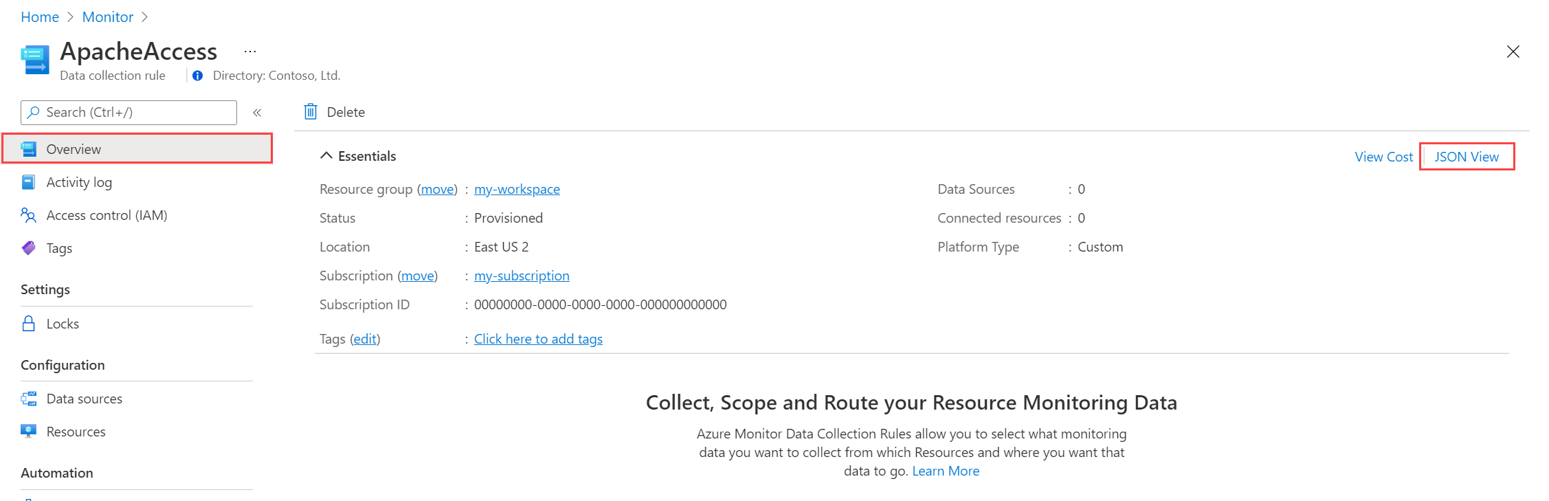 On the Monitor menu in the Azure portal, select Data collection rules and select the DCR you created. From Overview for the DCR, select JSON View.