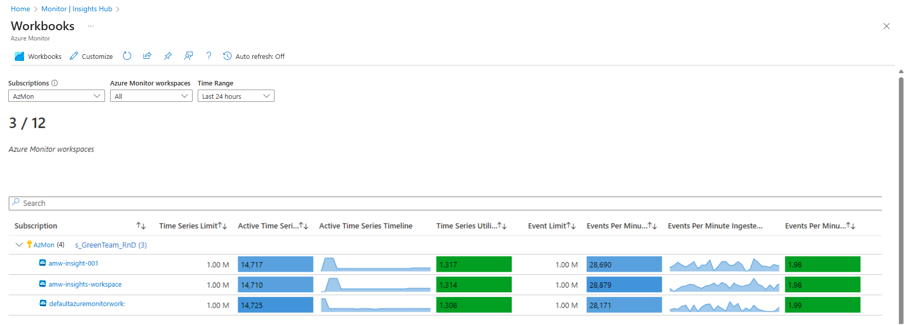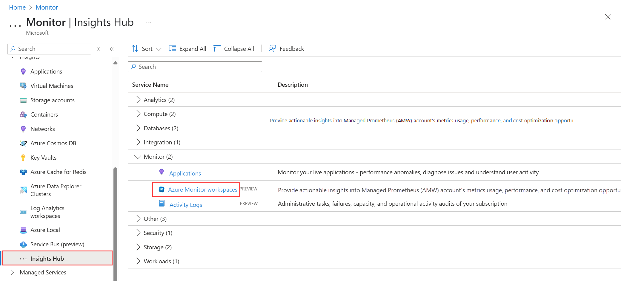 To view a summary of all Azure Monitor workspaces in your subscription, select Insights Hub from the Monitor menu and then select Azure Monitor workspaces. Click on a workspace to view more details.