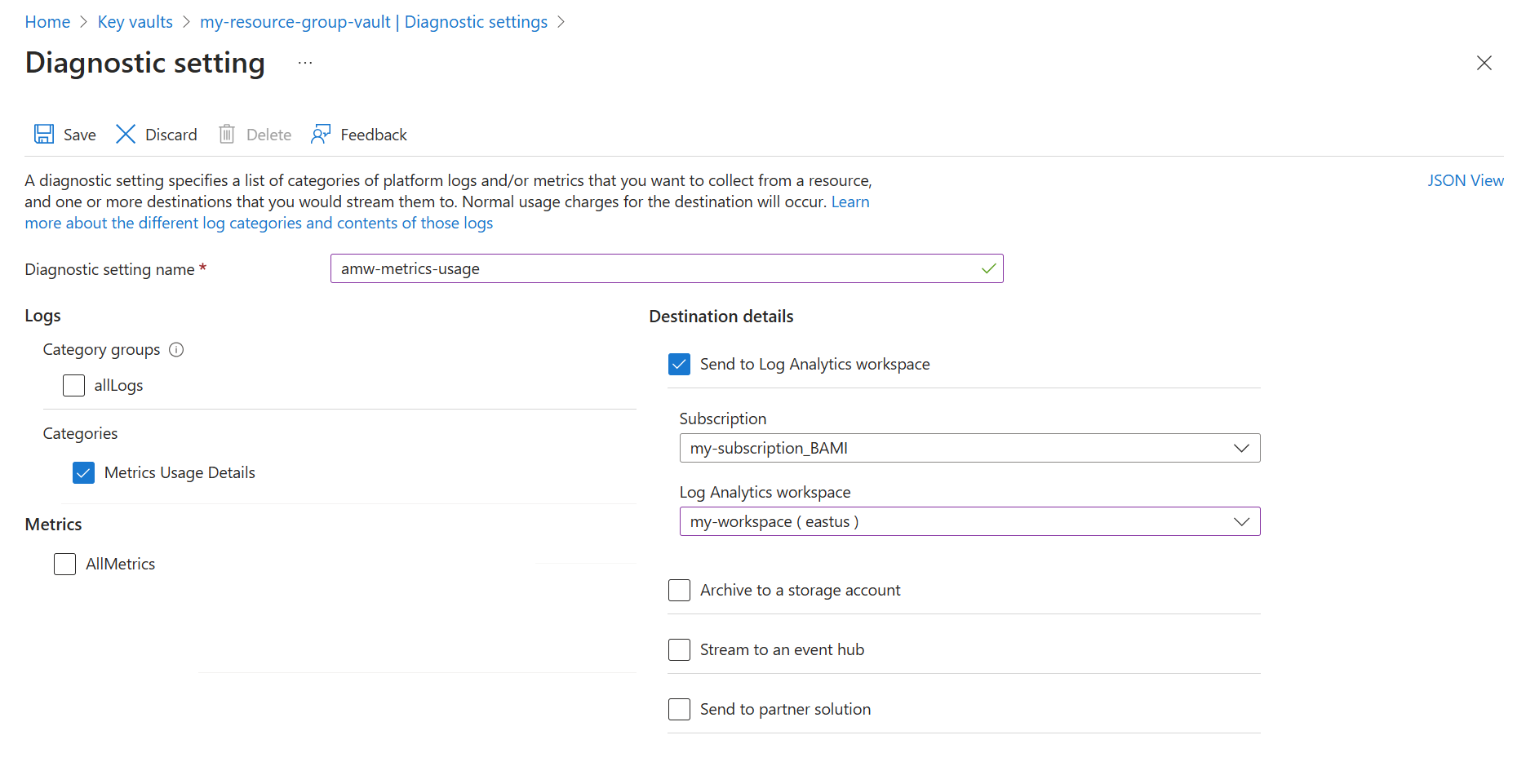 To enable metrics usage insights, you create a diagnostic setting, which instructs the AMW to send data supporting the insights queries and workbooks to a Log Analytics Workspace (LAW). You'll be prompted to enable it automatically when you create a new Azure Monitor workspace. You can enable it later for an existing Azure Monitor workspace.