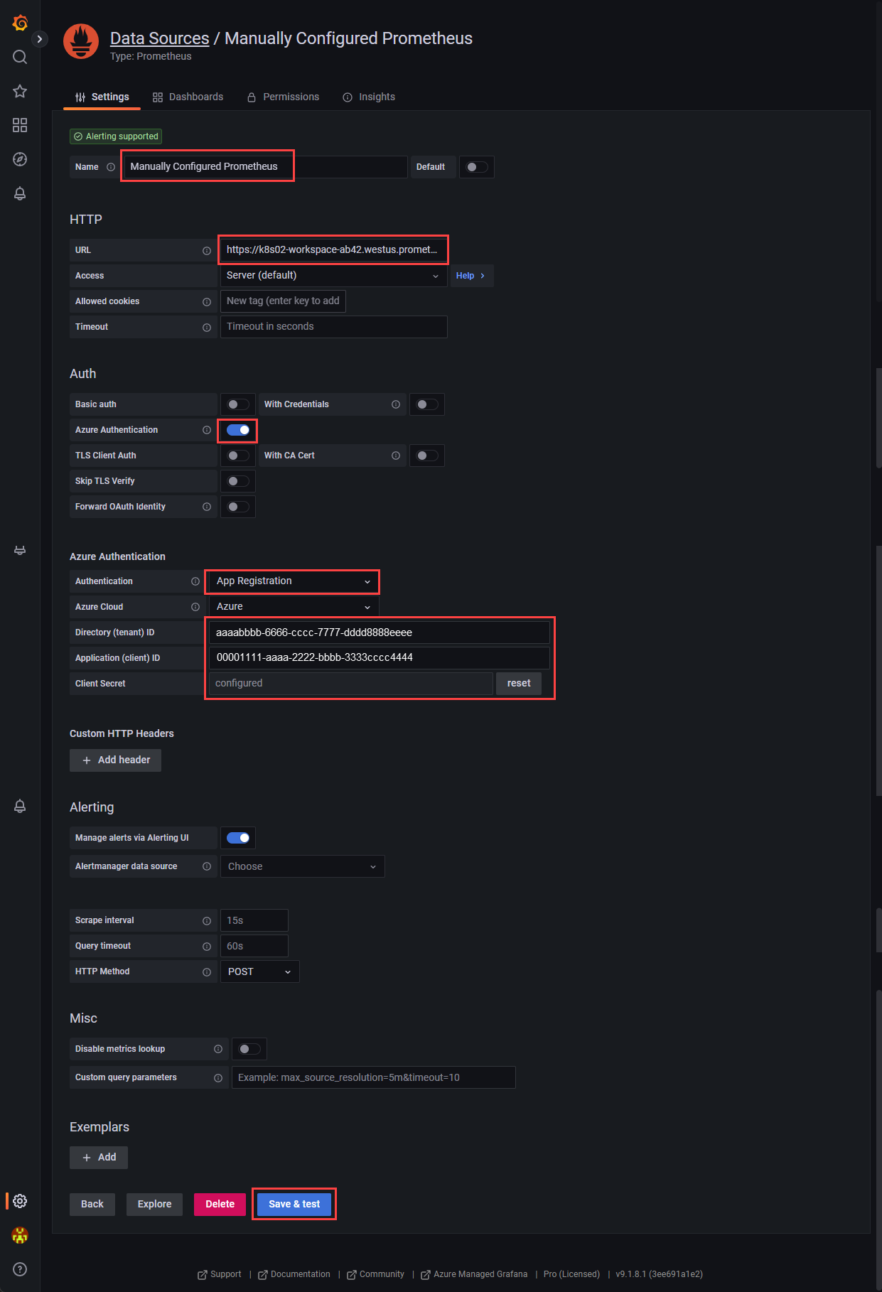 Screenshot that shows configuration for Prometheus data source.