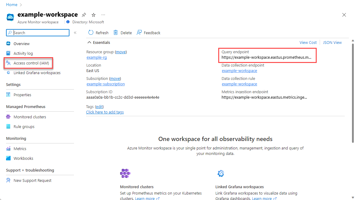 Azure Monitor managed service for Prometheus stores data in an Azure Monitor workspace. Each version of Grafana uses the query endpoint for this workspace to access it. To find the query endpoint, open the Overview page for your Azure Monitor workspace in the Azure portal.
