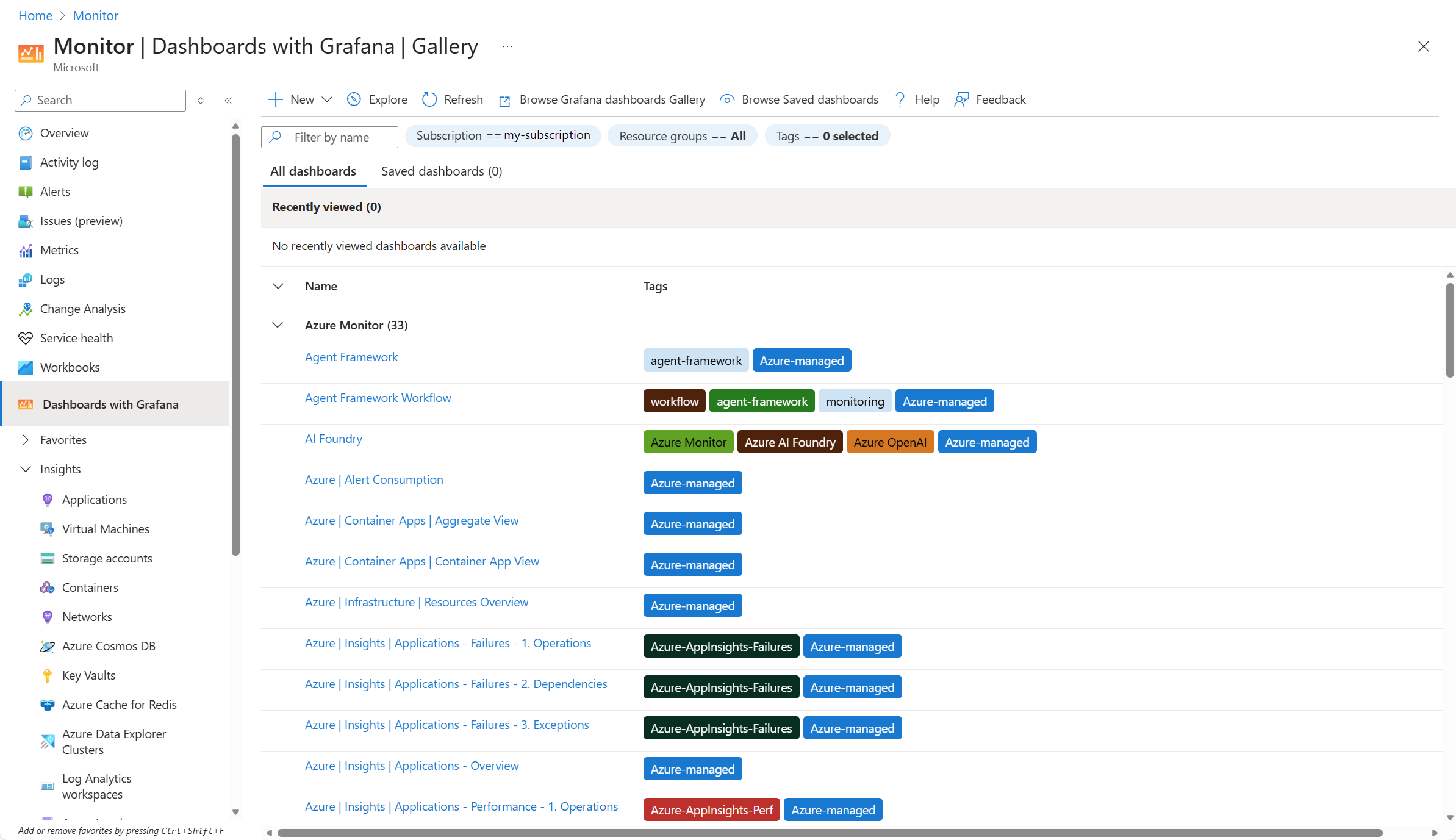 Azure Monitor dashboards with Grafana. Delivers Grafana dashboards for data collected in Azure Monitor directly in the Azure portal with no cost and no configuration requirements. Azure Managed Grafana. Fully managed Grafana service that supports dashboards using a variety of data sources.