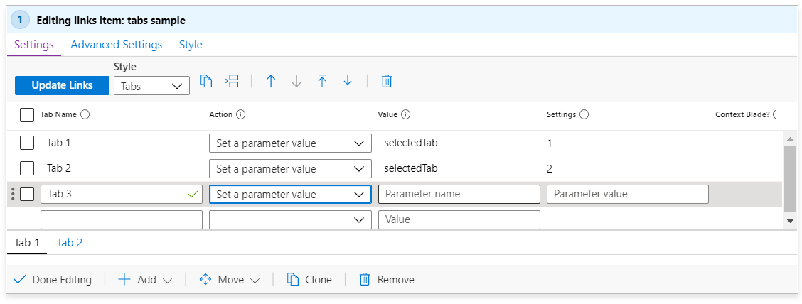 5. In the Value column, set the same parameter name (for example, selectedTab) for each tab.