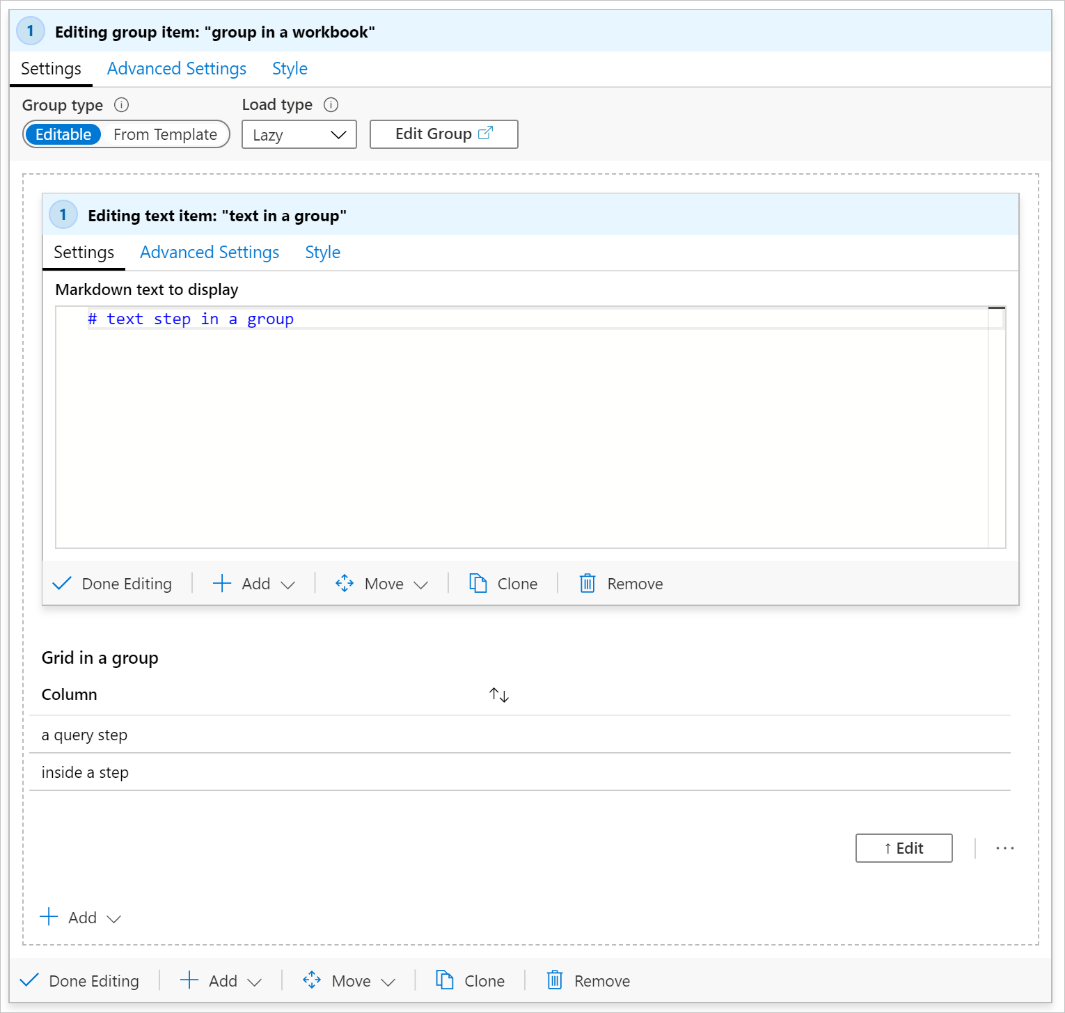 In edit mode, you can see those two items are actually inside a group item. In the screenshot below, the group is in edit mode. The group contains two items inside the dashed area. Each item can be in edit or read mode, independent of each other. For example, the text step is in edit mode while the query step is in read mode.
