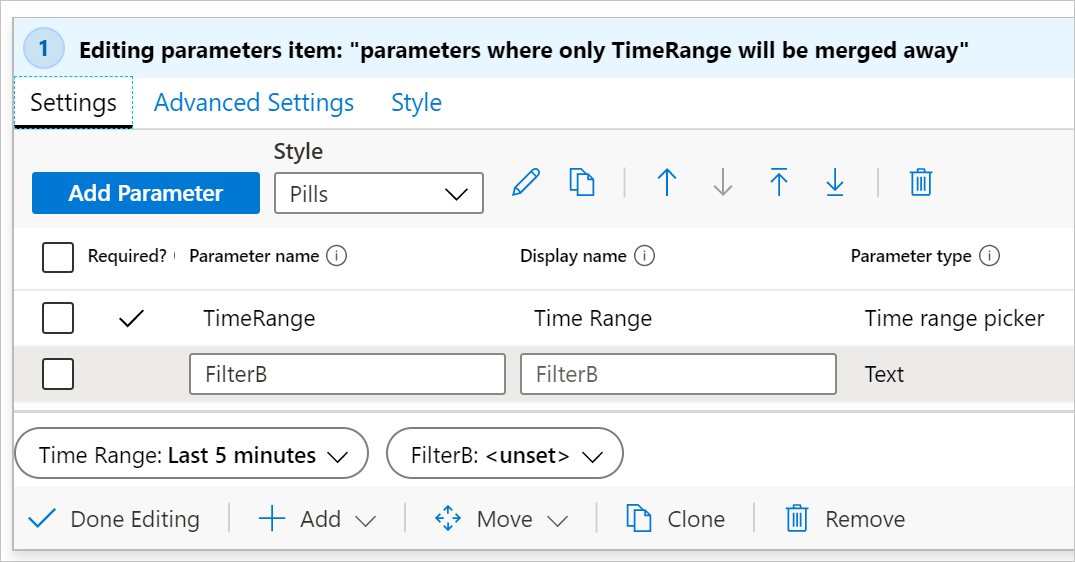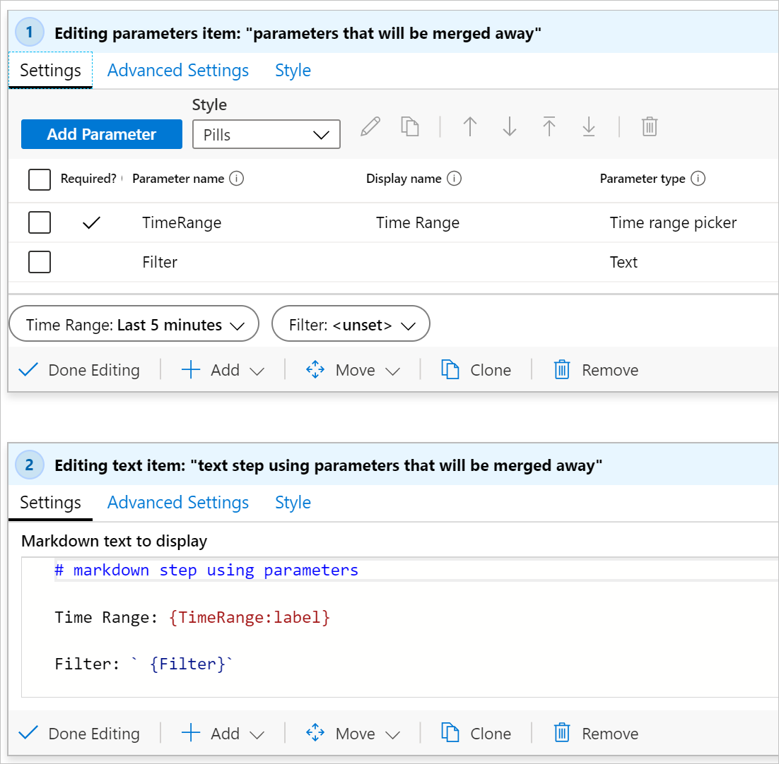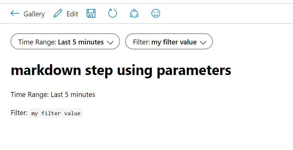 Suppose you have a template that has two parameters at the top, a time range parameter and a text parameter named "Filter": Screenshot showing top level parameters in a workbook.