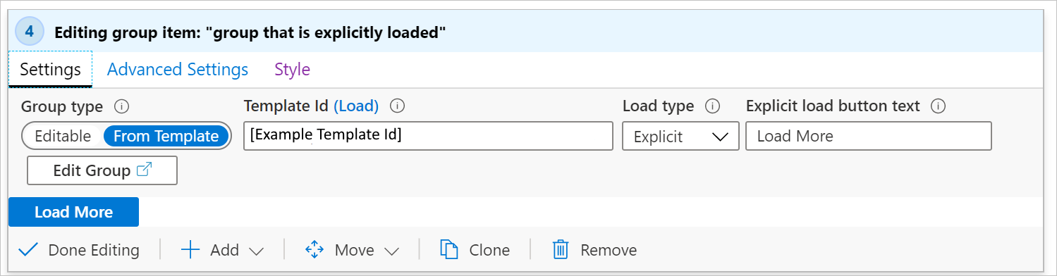 This screenshot shows explicit load settings with a configured "Load more" button. Screenshot of explicit load settings for a group in workbooks.