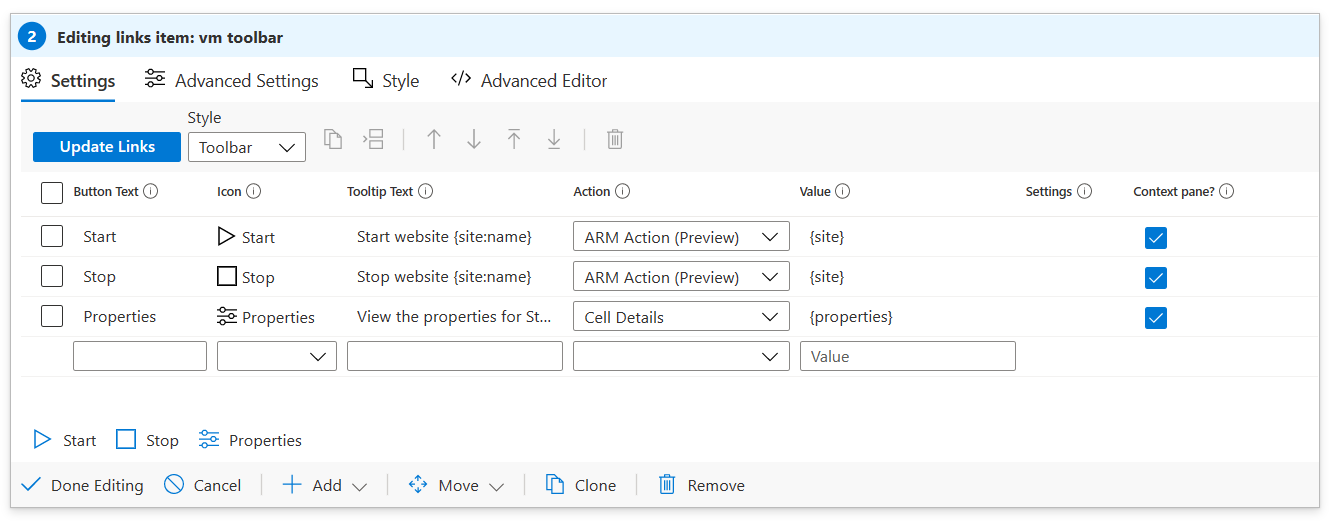 Use the Toolbar style to have your links appear styled as a toolbar. In toolbar style, the author must fill in fields for: