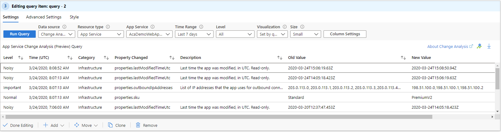 To make a query control that uses Change Analysis (classic) as the data source, use the Data source dropdown and select Change Analysis (classic). Then select a single resource. Changes for up to the last 14 days can be shown. Use the Level dropdown to filter between Important, Normal, and Noisy changes. This dropdown supports workbook parameters of the type drop down.