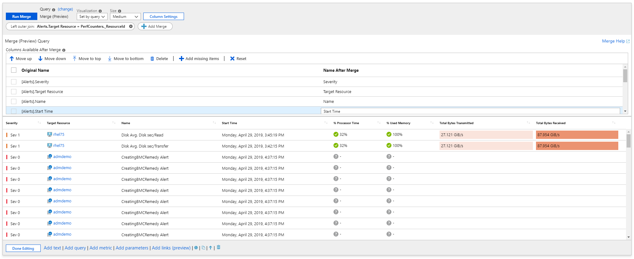 Screenshot that shows a workbook with a merge control that combines alert and Log Analytics data.