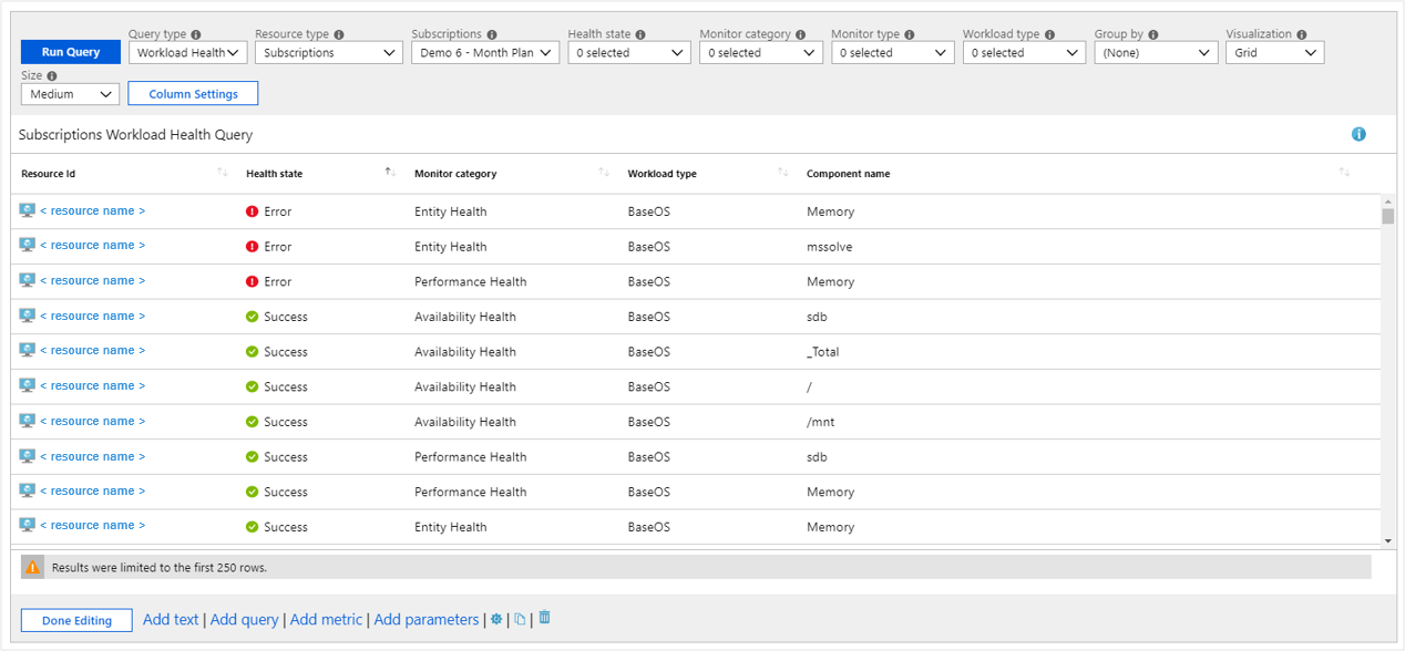 To make a query control that uses this data source, use the Query type dropdown to select Workload Health. Then select subscription, resource group, or VM resources to target. Use the health filter dropdowns to select an interesting subset of health incidents for your analytic needs.