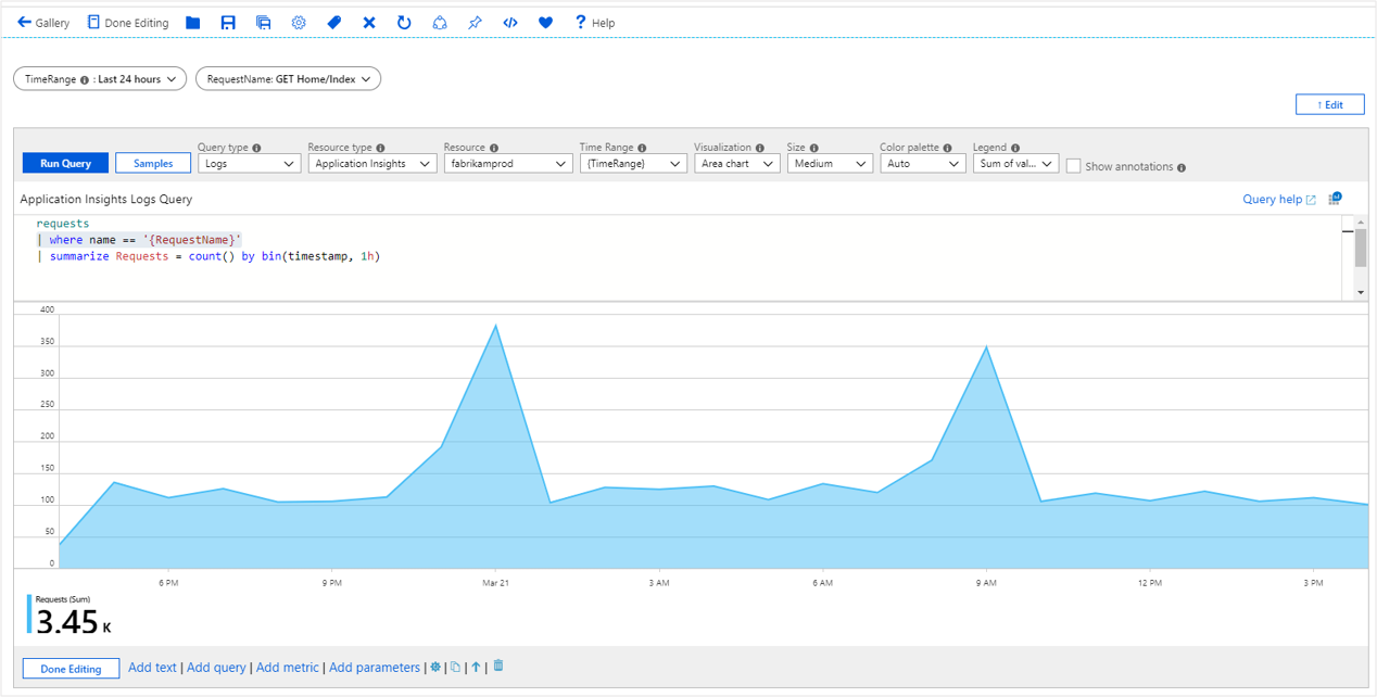 requests | where name == '{RequestName}' | summarize Requests = count() by bin(timestamp, 1h)The snippet expands on query evaluation time to: