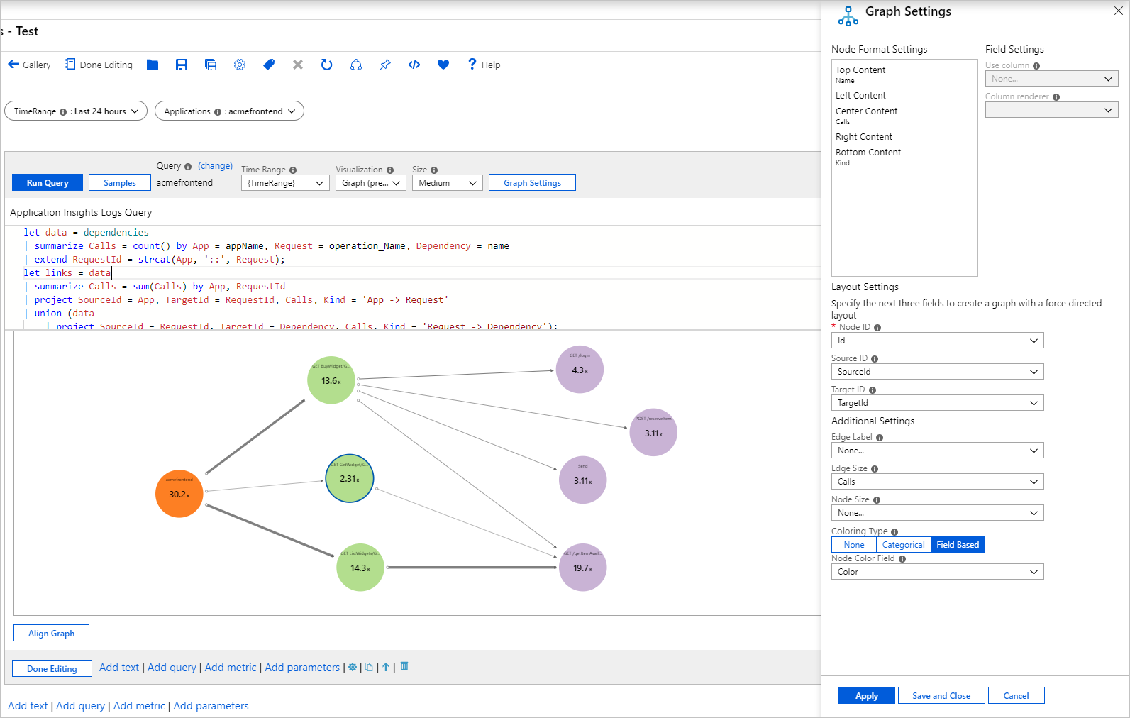let data = dependencies | summarize Calls = count() by App = appName, Request = operation_Name, Dependency = name | extend RequestId = strcat(App, '::', Request); let links = data | summarize Calls = sum(Calls) by App, RequestId | project SourceId = App, TargetId = RequestId, Calls, Kind = 'App -> Request' | union (data | project SourceId = RequestId, TargetId = Dependency, Calls, Kind = 'Request -> Dependency'); let nodes = data | summarize Calls = sum(Calls) by App | project Id = App, Name = App, Calls, Kind = 'App' | union (data | summarize Calls = sum(Calls) by RequestId, Request | project Id = RequestId, Name = Request, Calls, Kind = 'Request') | union (data | summarize Calls = sum(Calls) by Dependency | project Id = Dependency, Name = Dependency, Calls, Kind = 'Dependency'); nodes | union (links)Set Visualization to Graph.