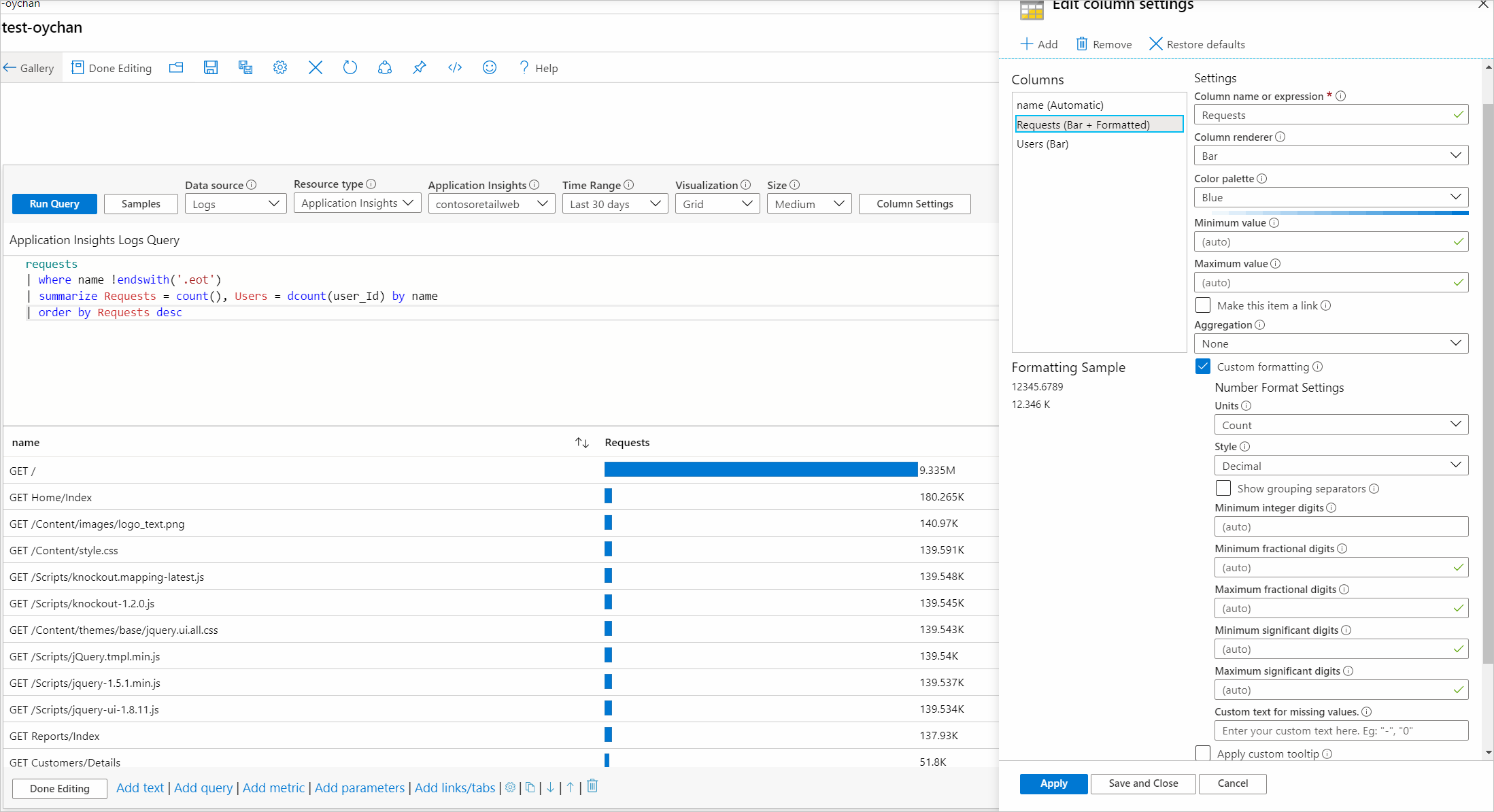 | Query | Any KQL query that returns data in the format expected by the chart visualization. | requests | summarize Requests = count() by name |