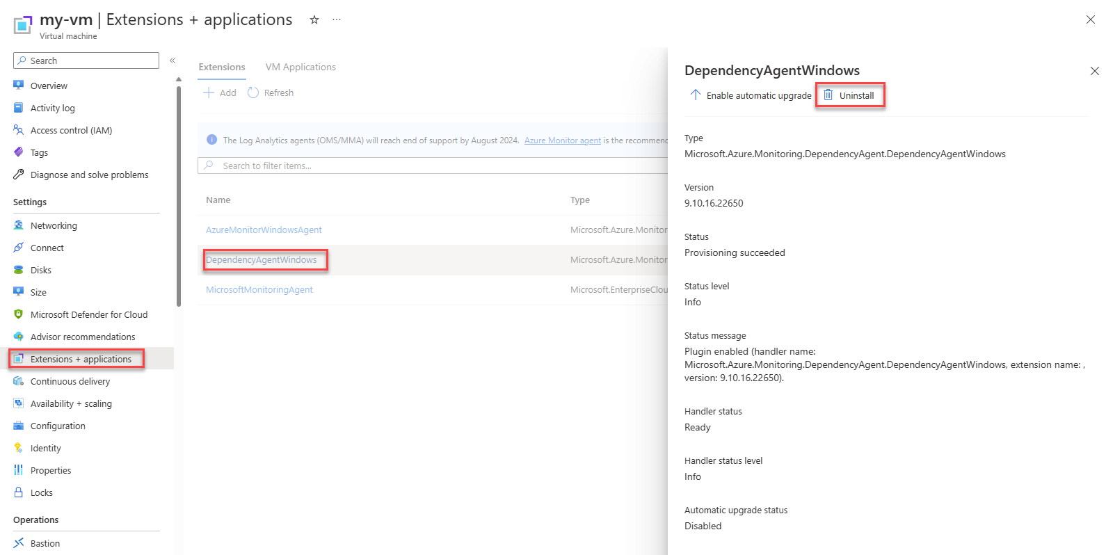 Select Extensions + applications > DependencyAgentWindows or DependencyAgentLinux > Uninstall.