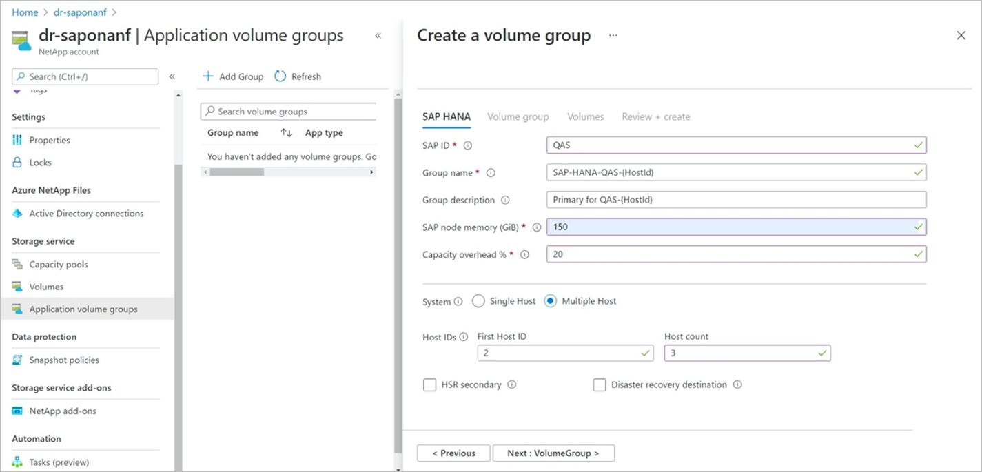 In the example screenshot below, the group nameSAP-HANA-SH9-{HostId}is a generic name. The corresponding numeric host ID for each host you add replaces{HostId}. Also, the numeric host ID for the volume group description replaces{HostId}. If{HostId}isn't specified, it's appended to the end for both the group name and description. - SAP node memory: