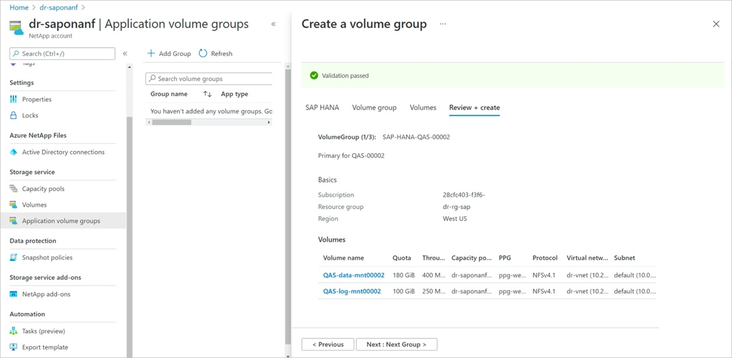 From your NetApp account, select Application volume groups, and select +Add Group. In Deployment Type, select SAP HANA then Next.