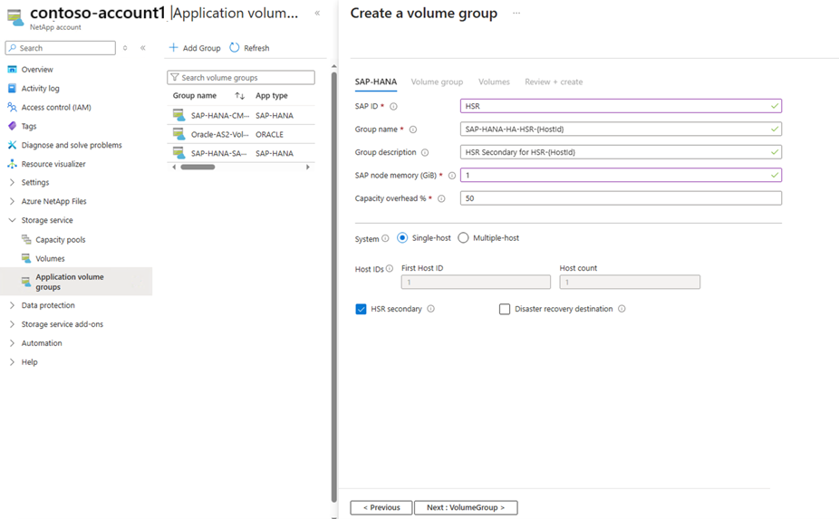 This article describes using application volume group to add volumes for an SAP HANA system as a secondary database in HANA System Replication (HSR).