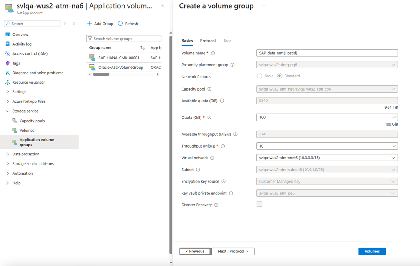 All volumes are placed in a single manual QoS capacity pool. If you want to create the log-backup and data-backup volumes in a separate capacity pool, you can choose not to add those volumes to the volume group.Virtual network: