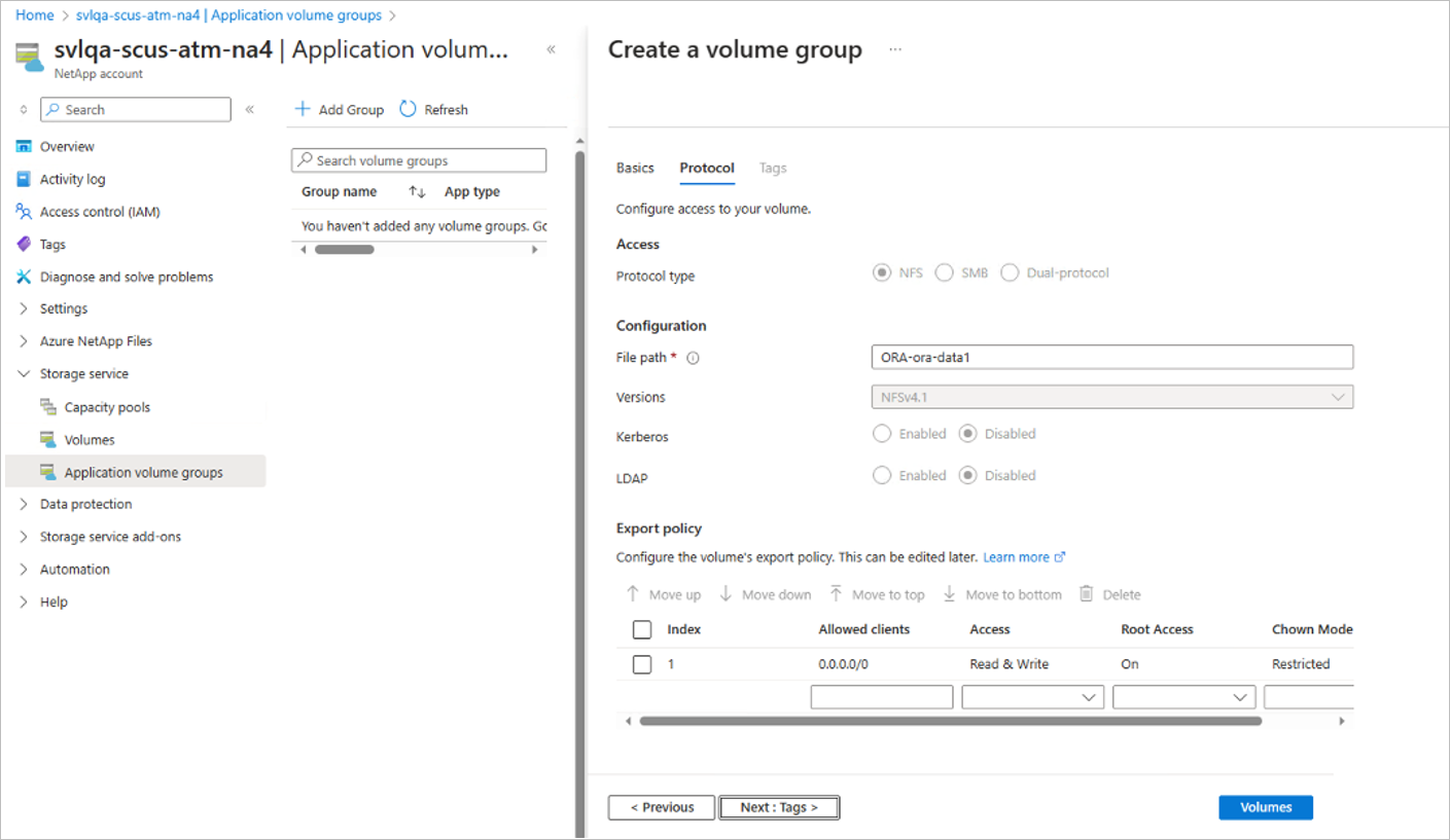 In the Volume Details - Protocol tab of a volume, the defaults are based on the volume group input you provided previously. You can adjust the file path that is used for mounting the volume, as well as the export policy.