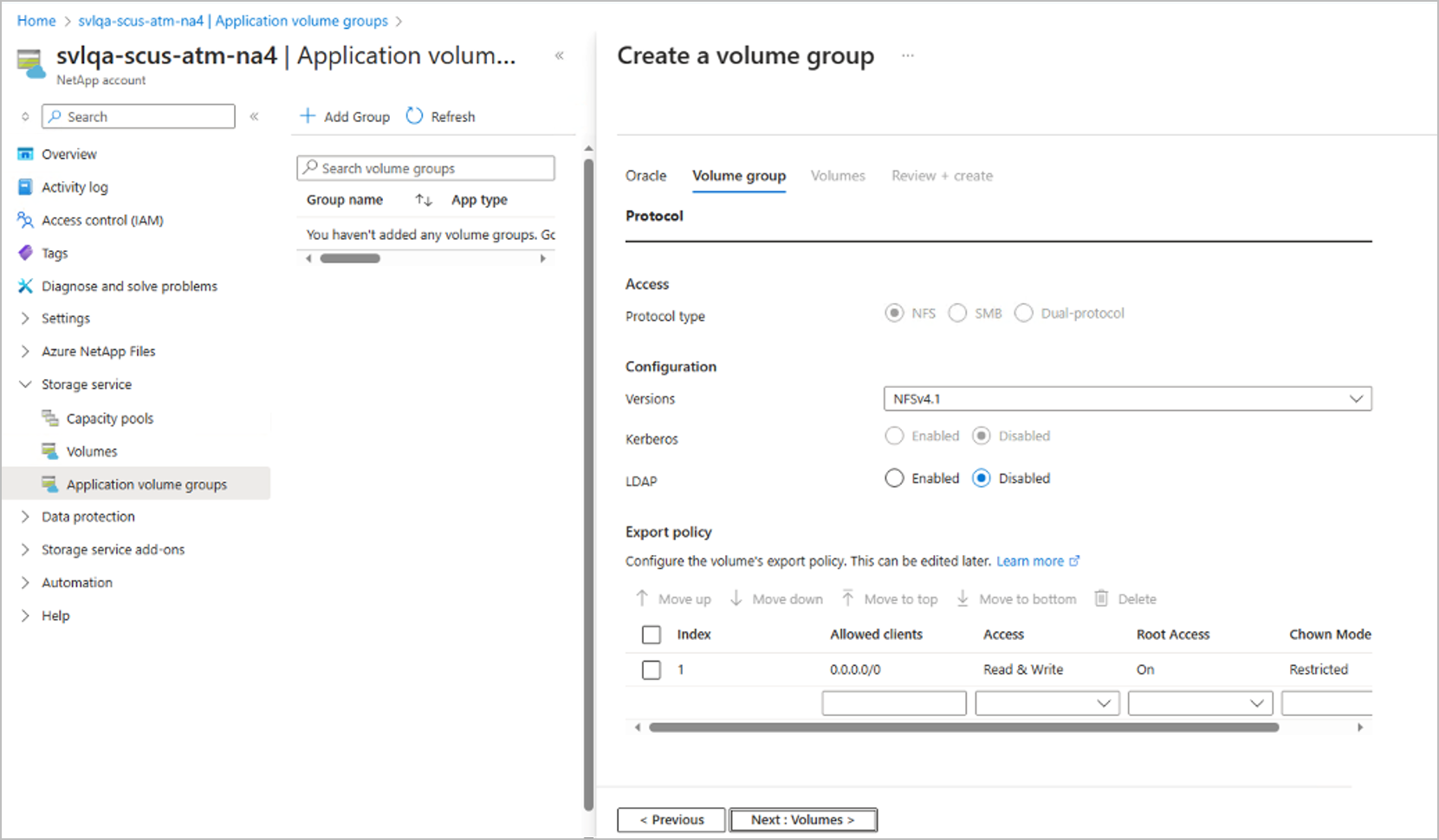 In the Protocols section of the Volume Group tab, you can select the NFS version, modify the Export Policy, and select LDAP-enabled volumes. These settings need to be common across all volumes in this volume group.
