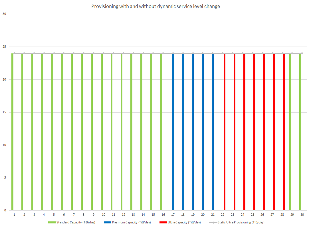 Consider a scenario where the capacity requirement is a constant 24 TiB. But your performance needs fluctuate between 384 hours (16 days) of Standard service level, 120 hours (5 days) of Premium service level, 168 hours (7 days) of Ultra service level, and then back to 48 hours (2 days) of standard service level performance. In this scenario, a dynamic cloud consumption deployment profile looks different compared to a traditional static on-premises consumption profile: