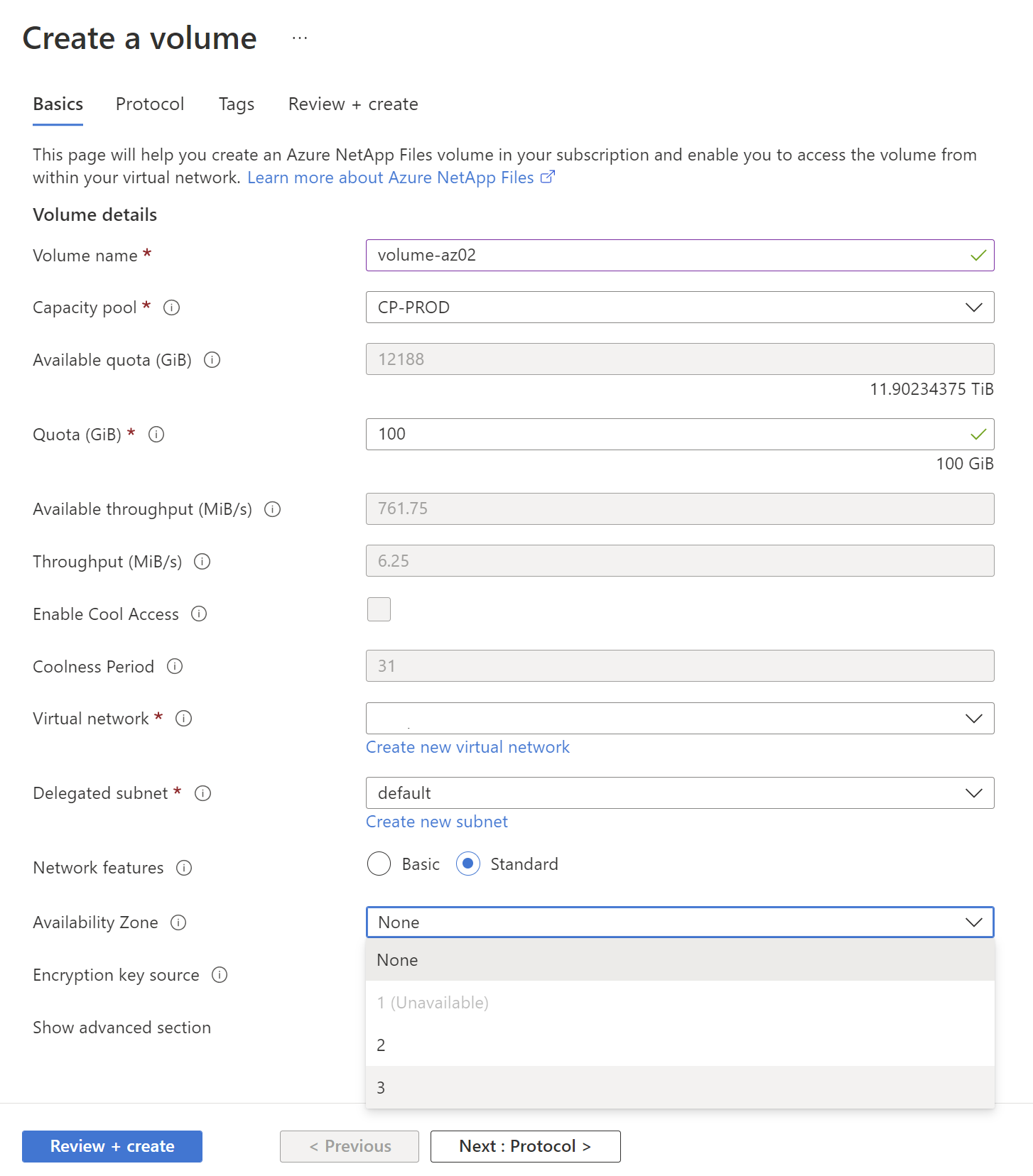 In the Create a Volume page, under the Basic tab, select the Availability Zone pulldown menu to specify an availability zone where Azure NetApp Files resources are present.