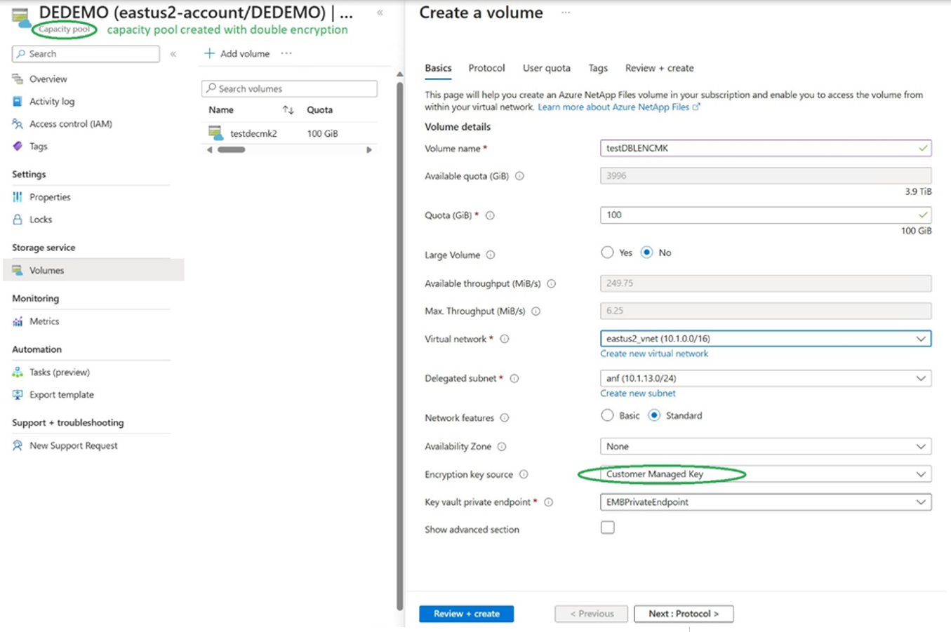 When you create a volume in a double-encryption capacity pool, the default key management (the Encryption key source field) is Microsoft Managed Key, and the other choice is Customer Managed Key. Using customer-managed keys requires additional preparation of an Azure Key Vault and other details. For more information about using volume encryption with customer managed keys, see Configure customer-managed keys for Azure NetApp Files volume encryption.
