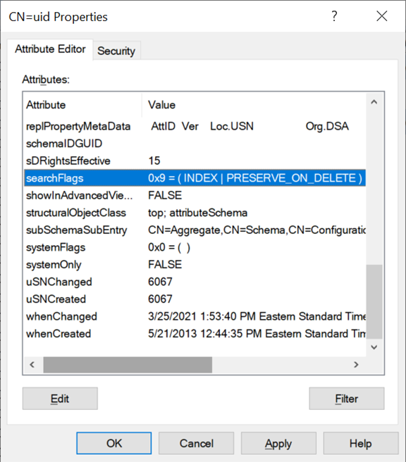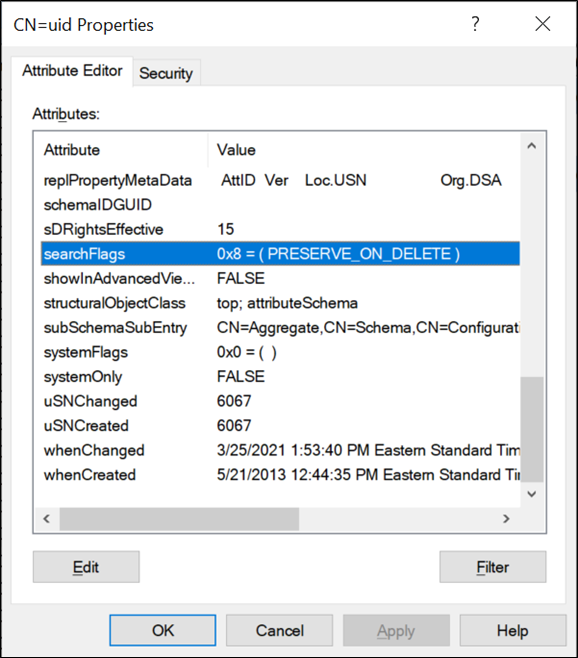 By default, the uid attribute object’s searchFlags are set to 0x8 (PRESERVE_ON_DELETE). This default setting ensures that even if the object in Active Directory is deleted, the attribute value remains stored in the directory as a historical record of the user’s attribute.