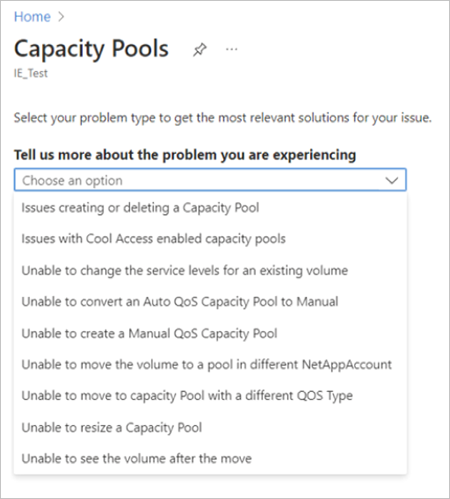 Choose a problem type for the issue you are experiencing, for example, Capacity Pools.