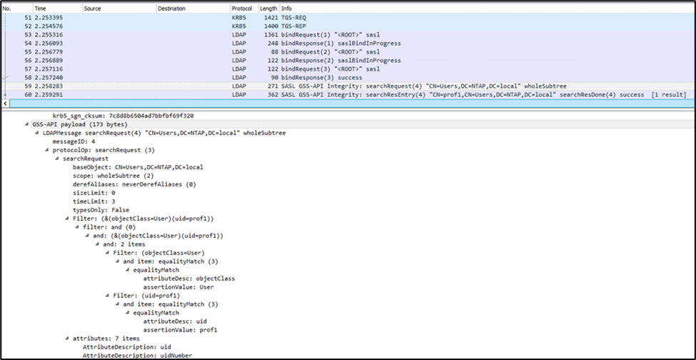 Kerberos 5p (privacy; krb5p) provides end-to-end encryption of all NFS traffic as shown in the trace image using a GSS/Kerberos wrapper. This method creates the most performance overhead due to the need to process every NFS packet’s encryption.