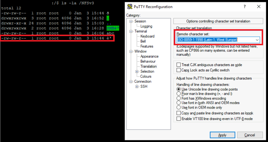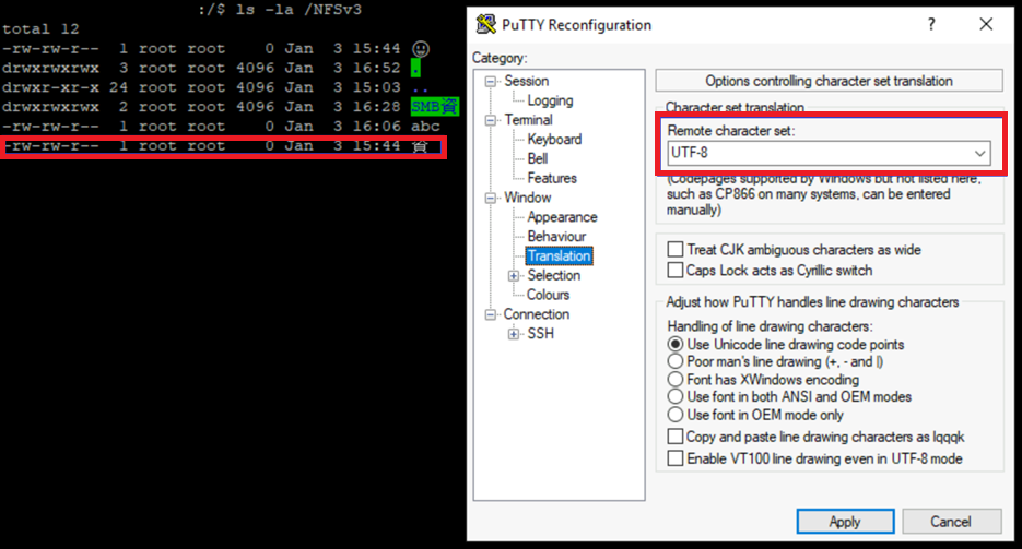 When a PuTTY window uses UTF-8 (found in Windows's translation settings), the character is represented properly for an NFSv3 mounted volume in Azure NetApp Files: