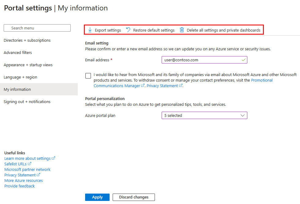 If you've made changes to the Azure portal settings and want to discard them, select Restore default settings from the top of the My information pane. You'll be prompted to confirm this action. If you do so, any changes you've made to your Azure portal settings are lost. This option doesn't affect dashboard customizations.