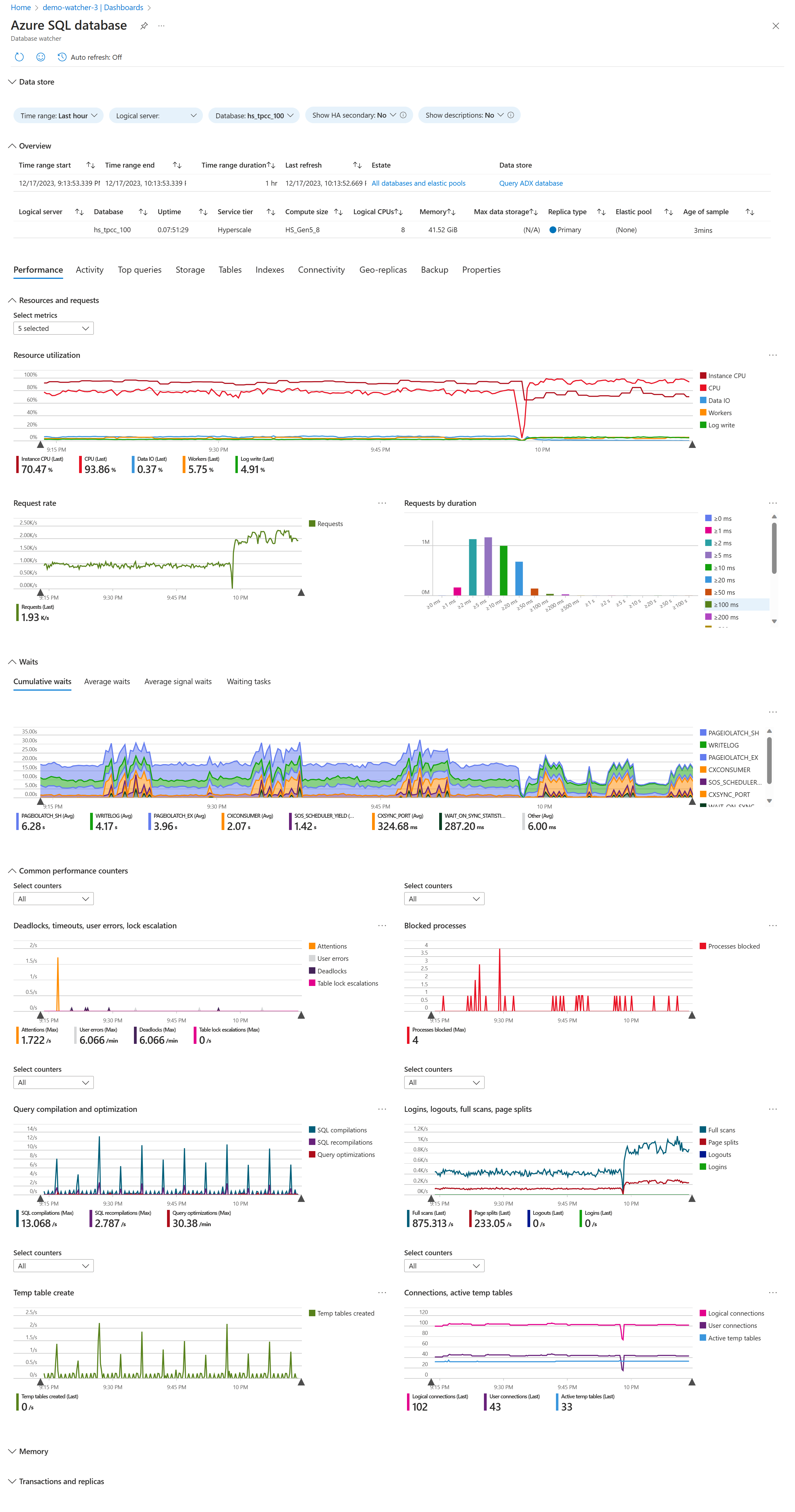 Here is an example showing a partial view of the Performance tab of an Azure SQL database dashboard. Select the image to zoom into details.